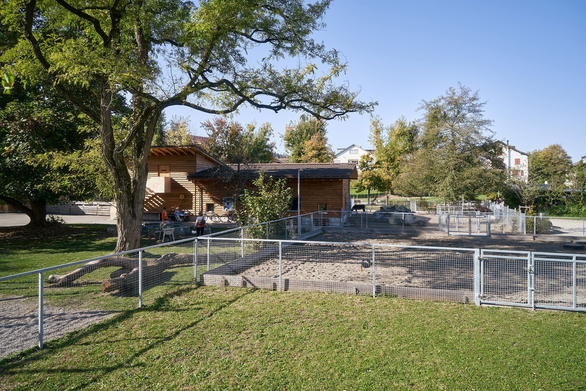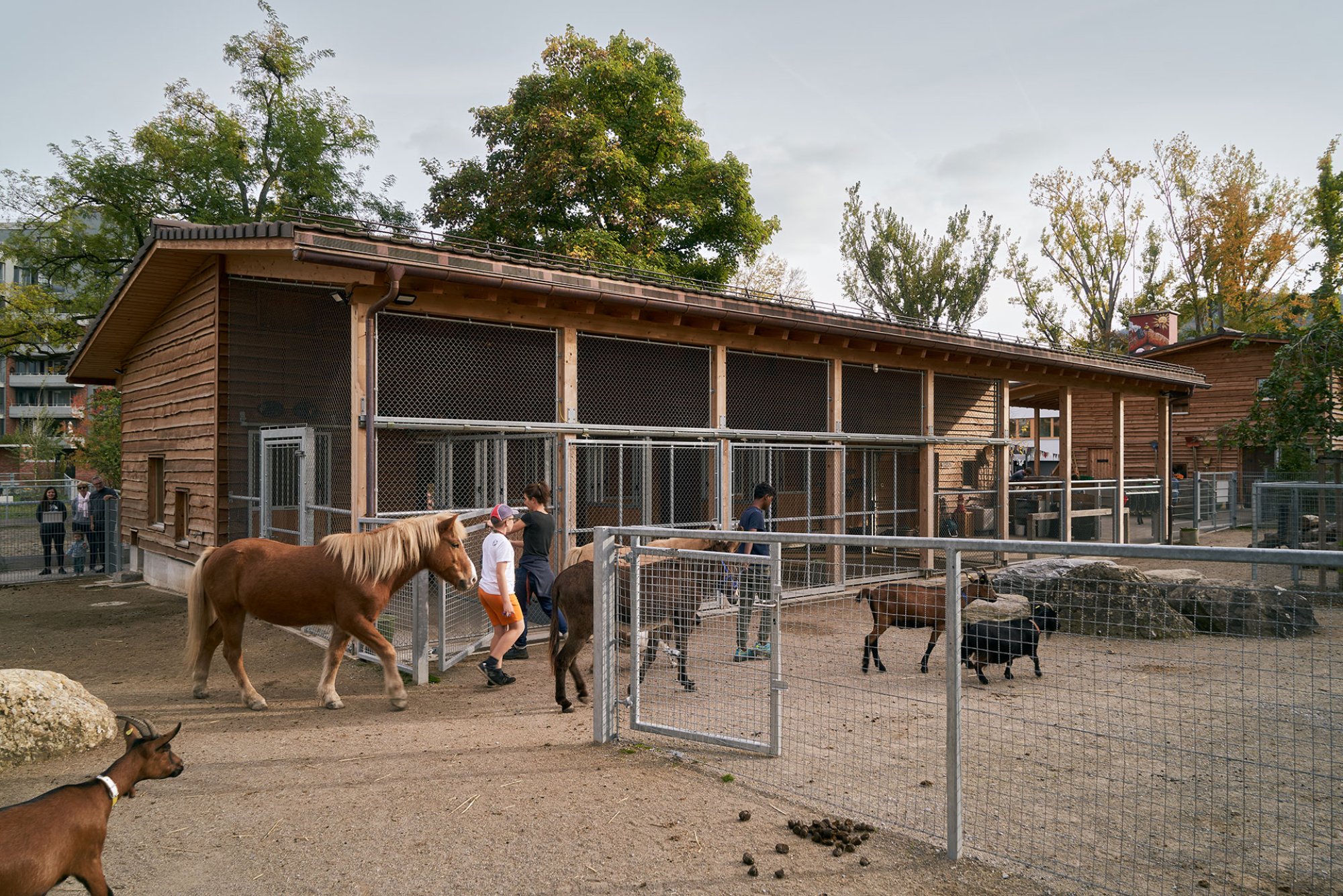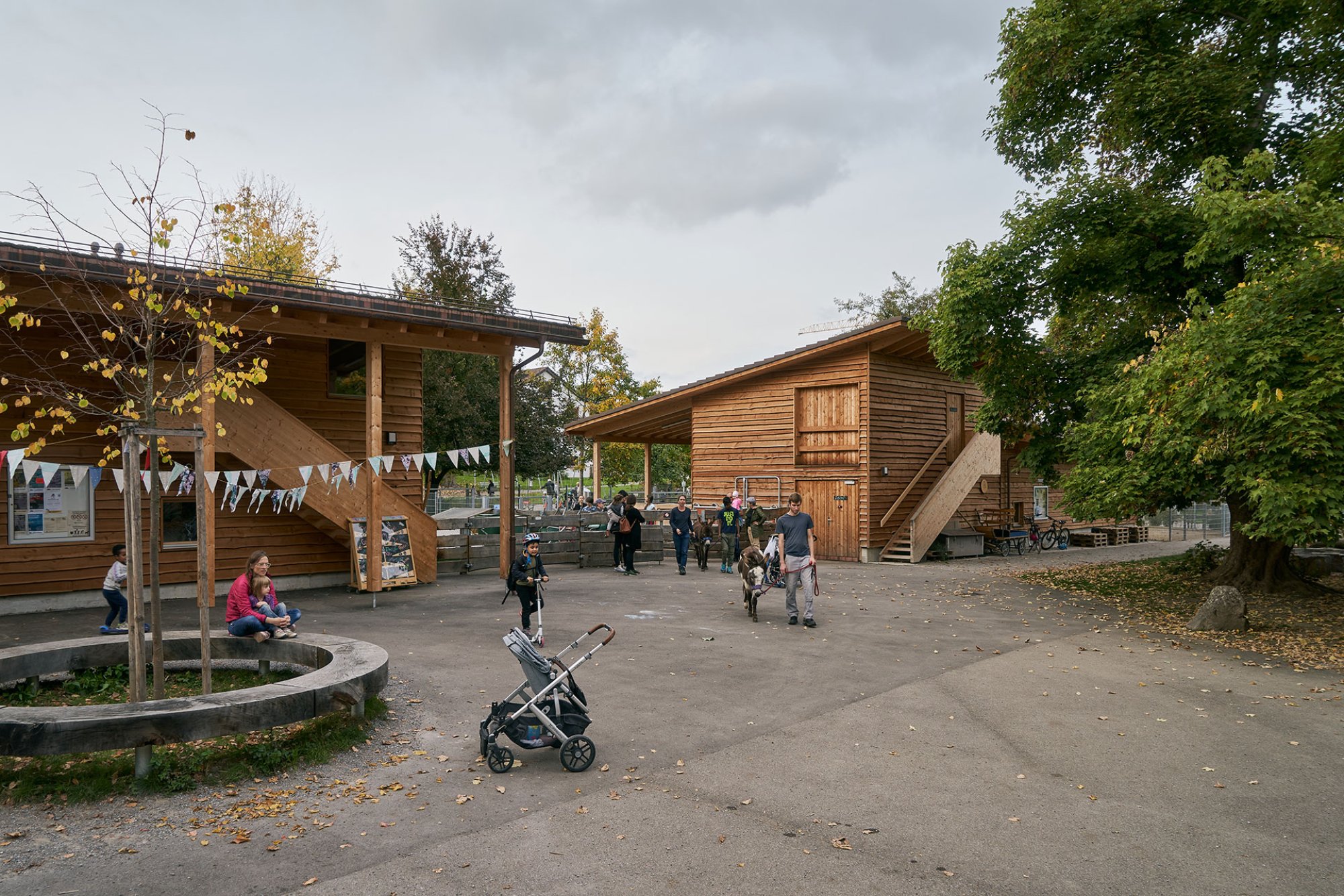 Die zwei neuen Tierställe arrangieren sich um den offenen, belebten Platz des Gemeinschaftszentrum Bachwiesen und gliedern sich in die bestehende Parkanlage ein. Die zwei Ställe beherbergen einerseits Kleintiere wie Gefieder, Hasen und Meerschweinchen und anderseits Esel, Ponys sowie Ziegen. Die beiden Ställe sind über einen schliessbaren Vorhof miteinander verbunden und verfügen über einen gedeckten Aussenbereich für die Tiere.