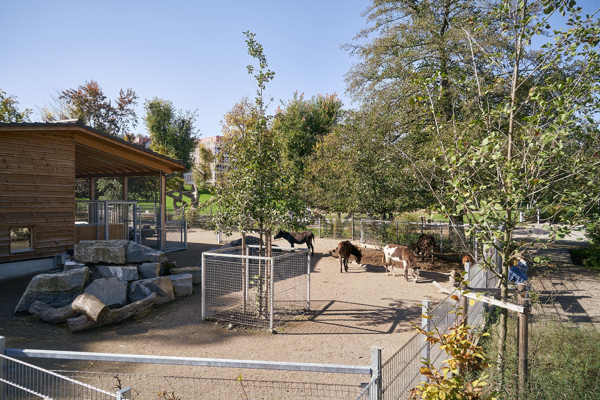 Neben den Ställen und den Aussengehegen ergänzen eine Weide und ein Longierzirkel die nutzbaren Tierbereiche. Für das Quartier wird zudem der Quartiergarten neu erstellt und ein Aufenthaltsplatz mit Sitzmöglichkeiten und einer Feuerstelle ergänzt.