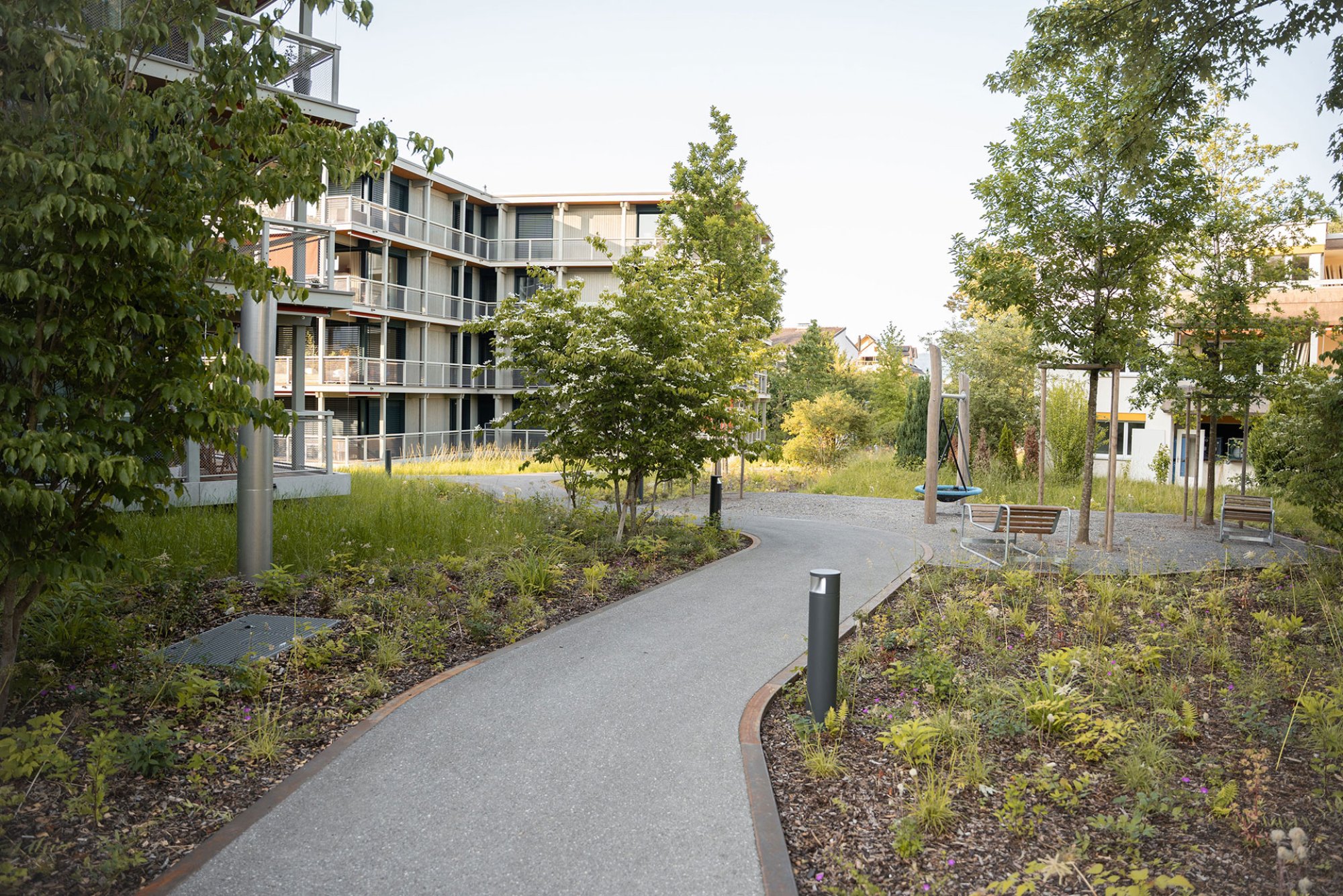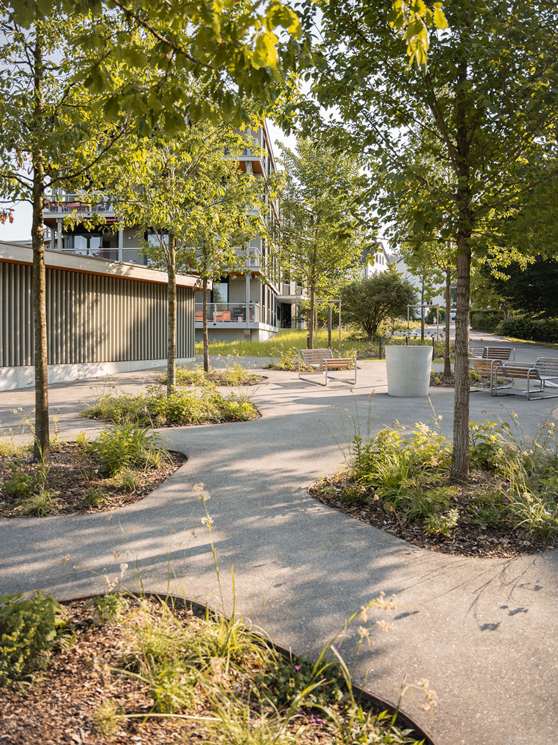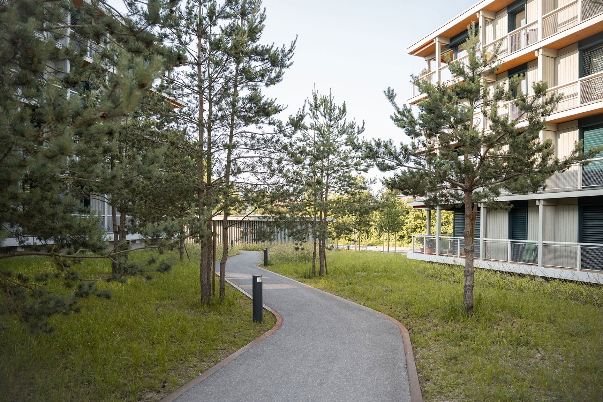 Grosszügige Grünflächen und ein geringer Anteil versiegelter Flächen leisten einen wertvollen Beitrag zum Mikroklima auf dem Areal. Sie fördern die ökologische Vernetzung und unterstützen die lokale Oberflächenentwässerung. Die Waldföhre dient als charakteristische Leitbaumart und verleiht dem Pflanzkonzept eine prägende Struktur. Die Bepflanzung setzt sich aus standortgerechten, vorwiegend einheimischen Arten zusammen und stärkt damit die ökologische Qualität des Freiraums.