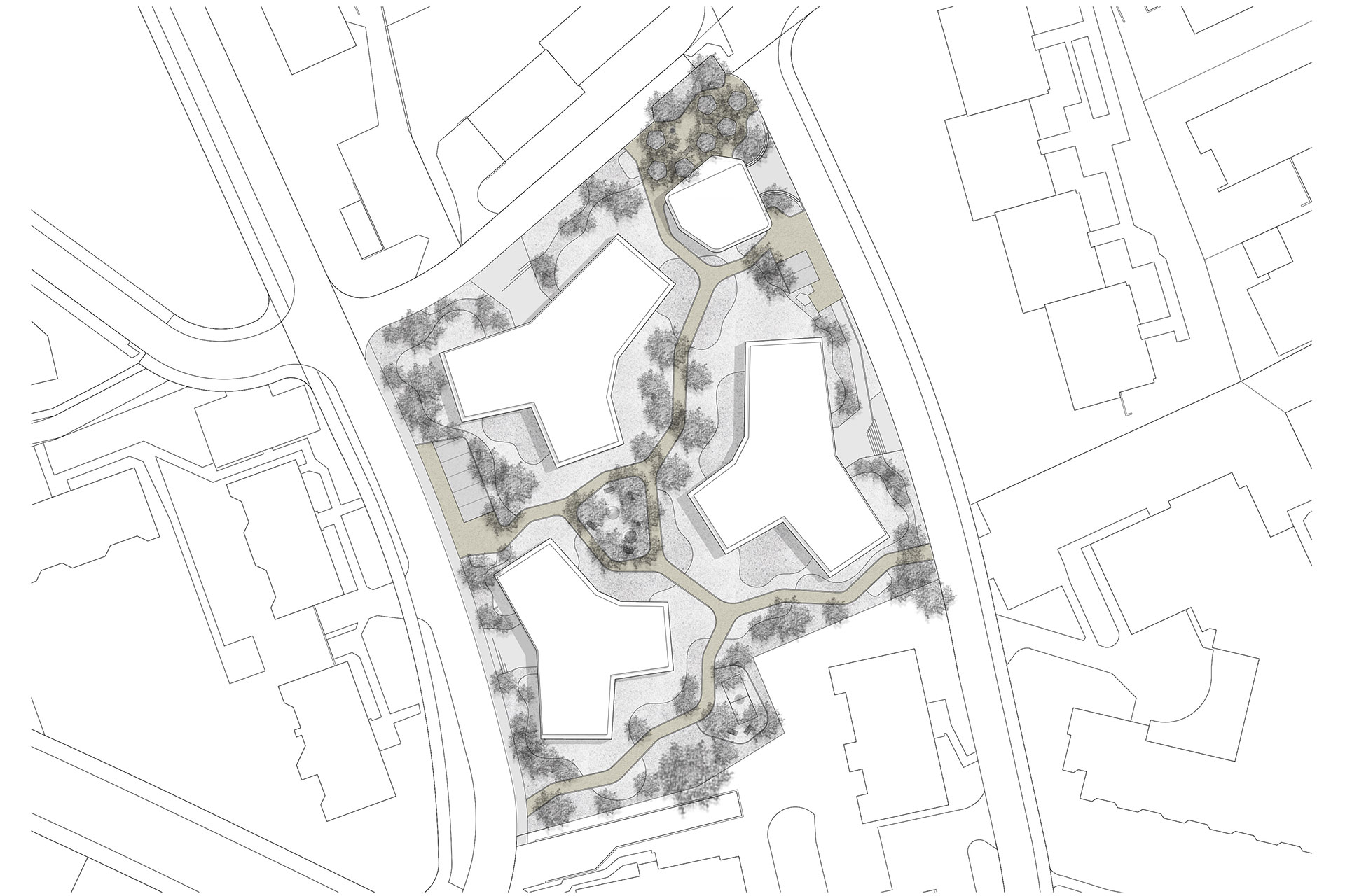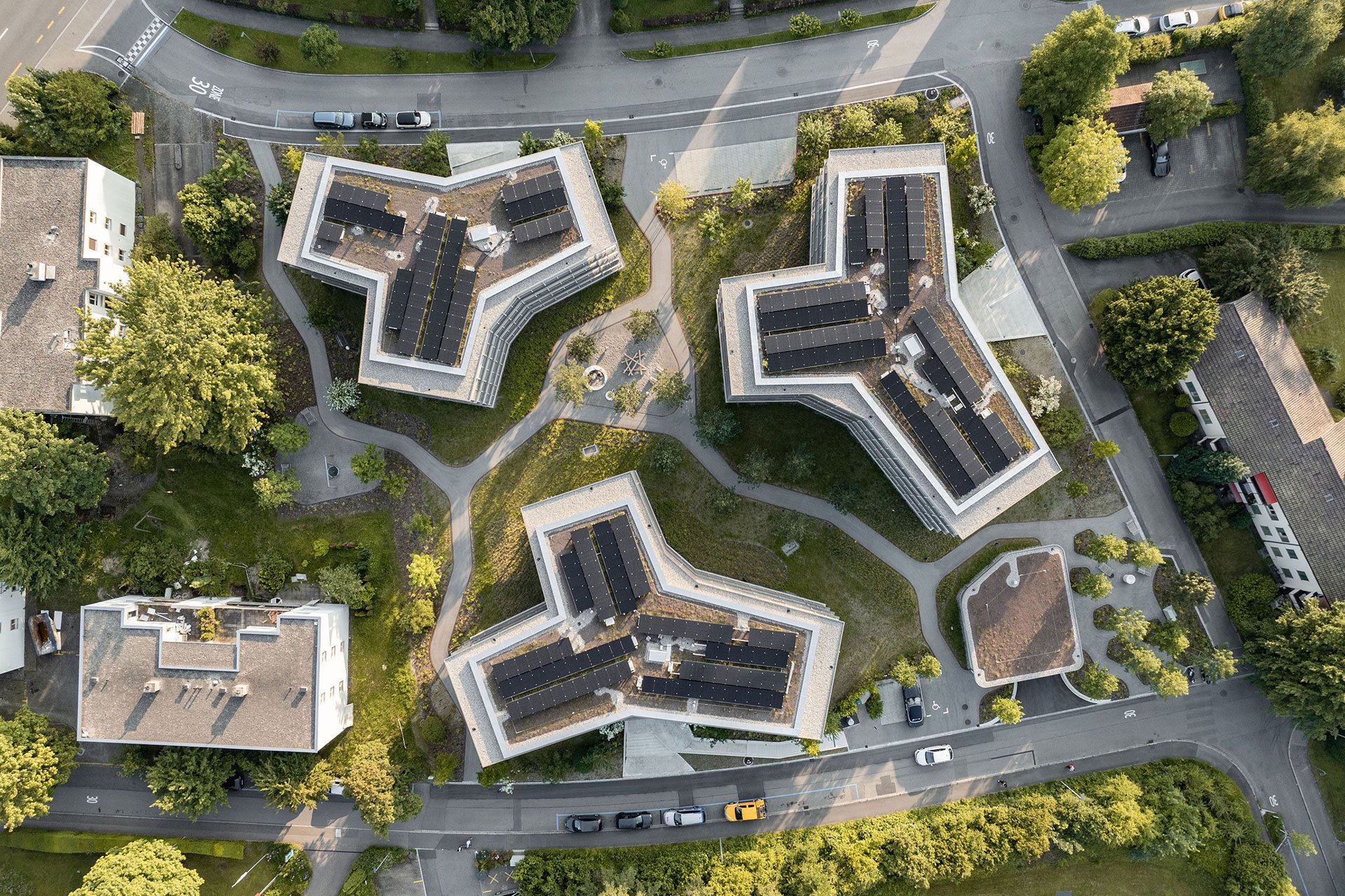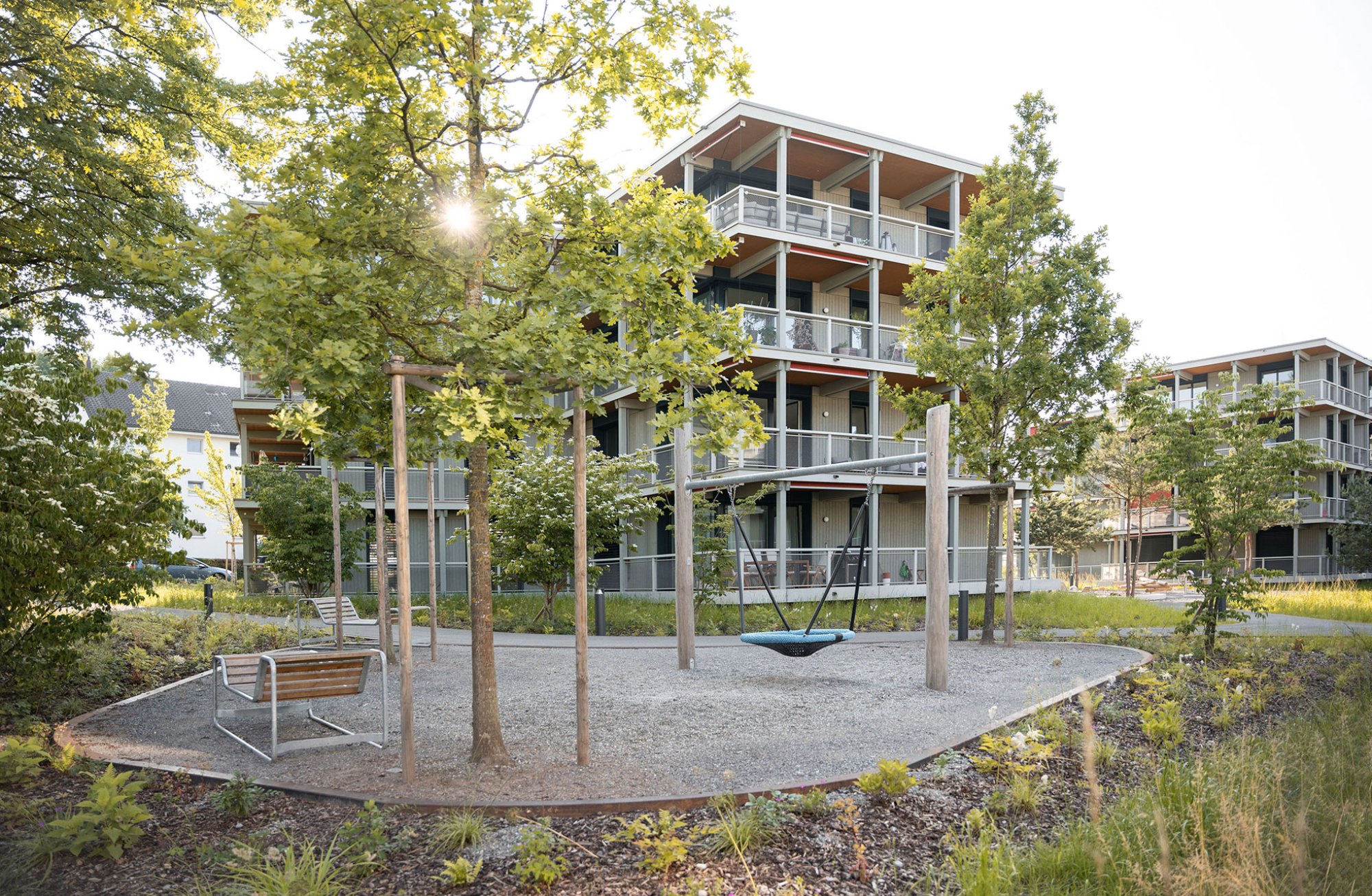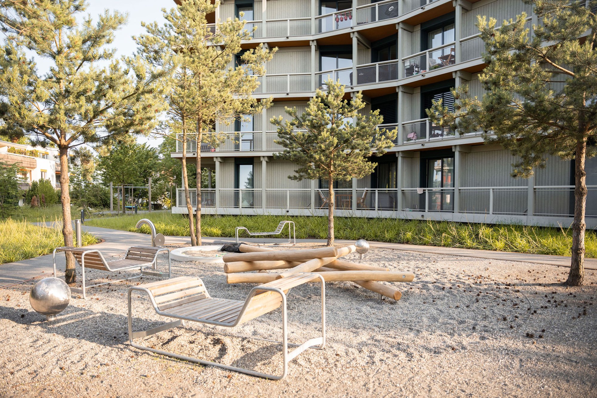 Grosszügige Grünflächen und ein geringer Anteil versiegelter Flächen leisten einen wertvollen Beitrag zum Mikroklima auf dem Areal. Sie fördern die ökologische Vernetzung und unterstützen die lokale Oberflächenentwässerung. Die Waldföhre dient als charakteristische Leitbaumart und verleiht dem Pflanzkonzept eine prägende Struktur. Die Bepflanzung setzt sich aus standortgerechten, vorwiegend einheimischen Arten zusammen und stärkt damit die ökologische Qualität des Freiraums.