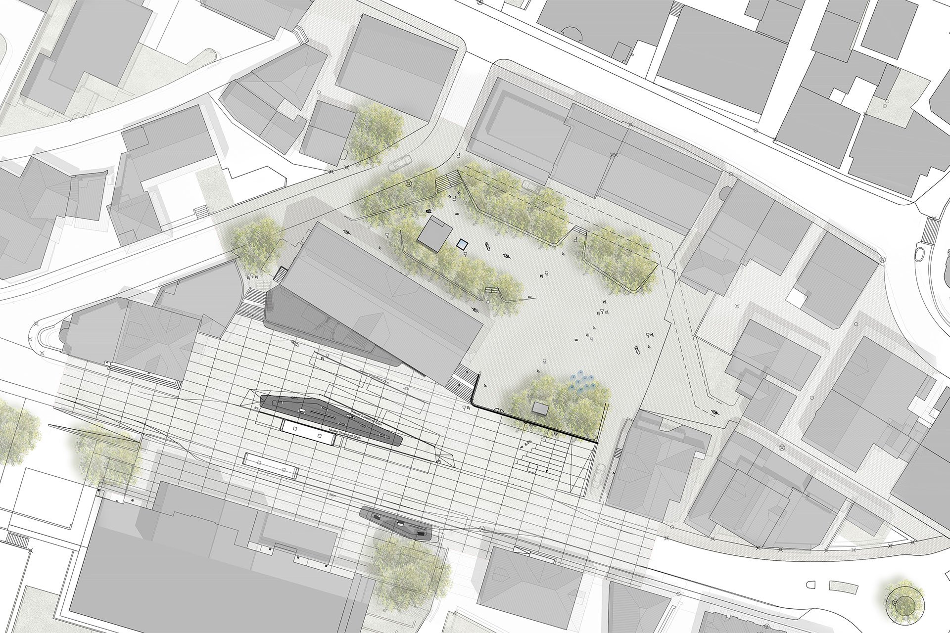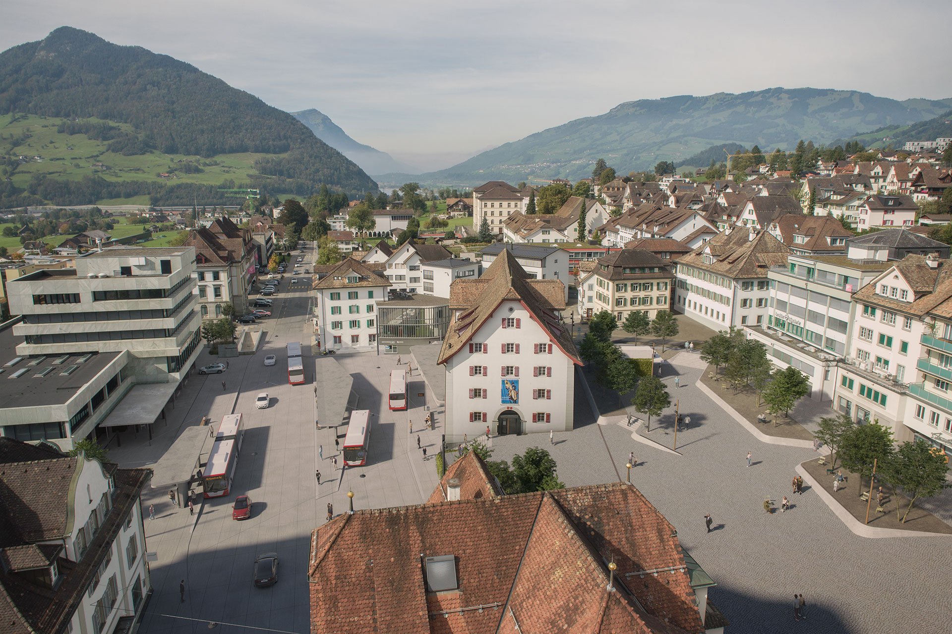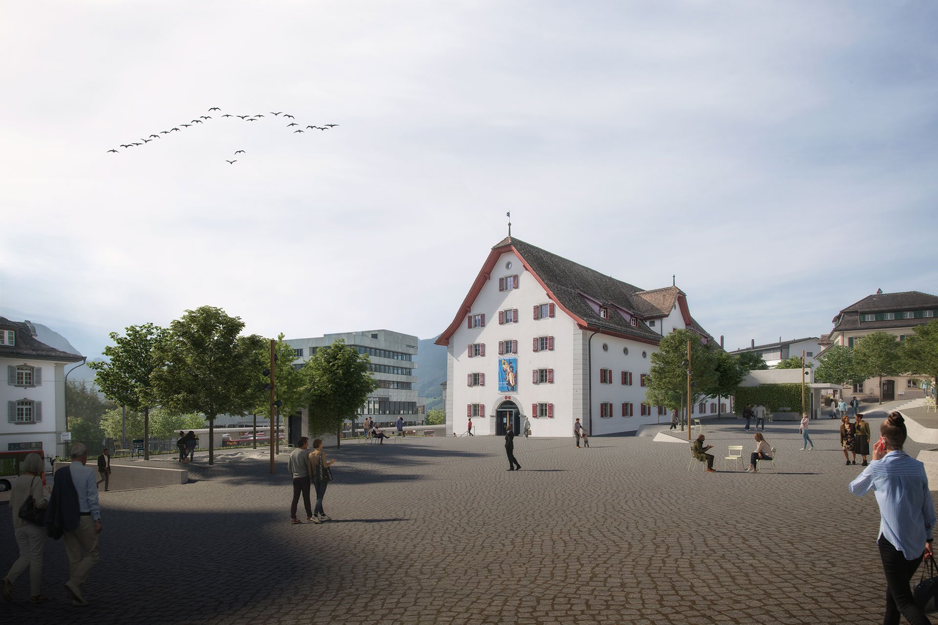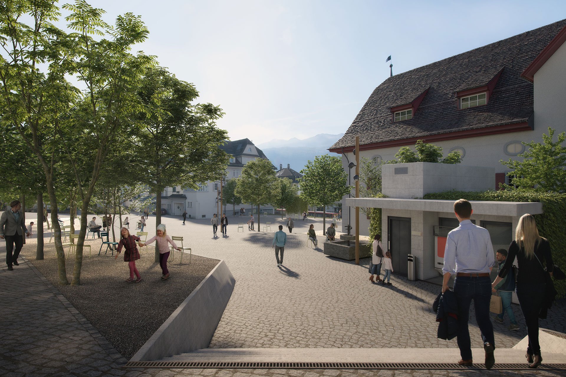 Grossformatige Betonplatten übernehmen die einheitliche Platzgestaltung des Bushofes und unterstreichen dessen Funktionalität. Im Gegensatz dazu wird die Hofmatt mit Natursteinparkett ausgebildet. Wesentliches Grünelement der Bahnhofstrasse bilden Einzelbäume sowie kleinere Baumgruppen. Diese werden entlang der Bahnhofstrasse ins Zentrum weitergeführt und als lockere Bepflanzung auf dem Platz fortgeführt. Ein Baumdach bildet ein zentraler Treffpunkt auf der Hofmatt und wird mit einer öffentlichen Nutzung aufgewertet. Auf der Bahnhofstrasse wird im Bereich Bundesbriefmuseum bis zum Kreisel Postplatz eine Tempo-30-Zone eingeführt. Die Fussgängerstreifen werden aufgehoben. Es darf überall innerhalb der Tempo-30-Zone die Strasse gequert werden! Der Bushof wird als Begegnungszone Tempo 20 ausgebildet und mittels eines Materialwechsels räumlich definiert.