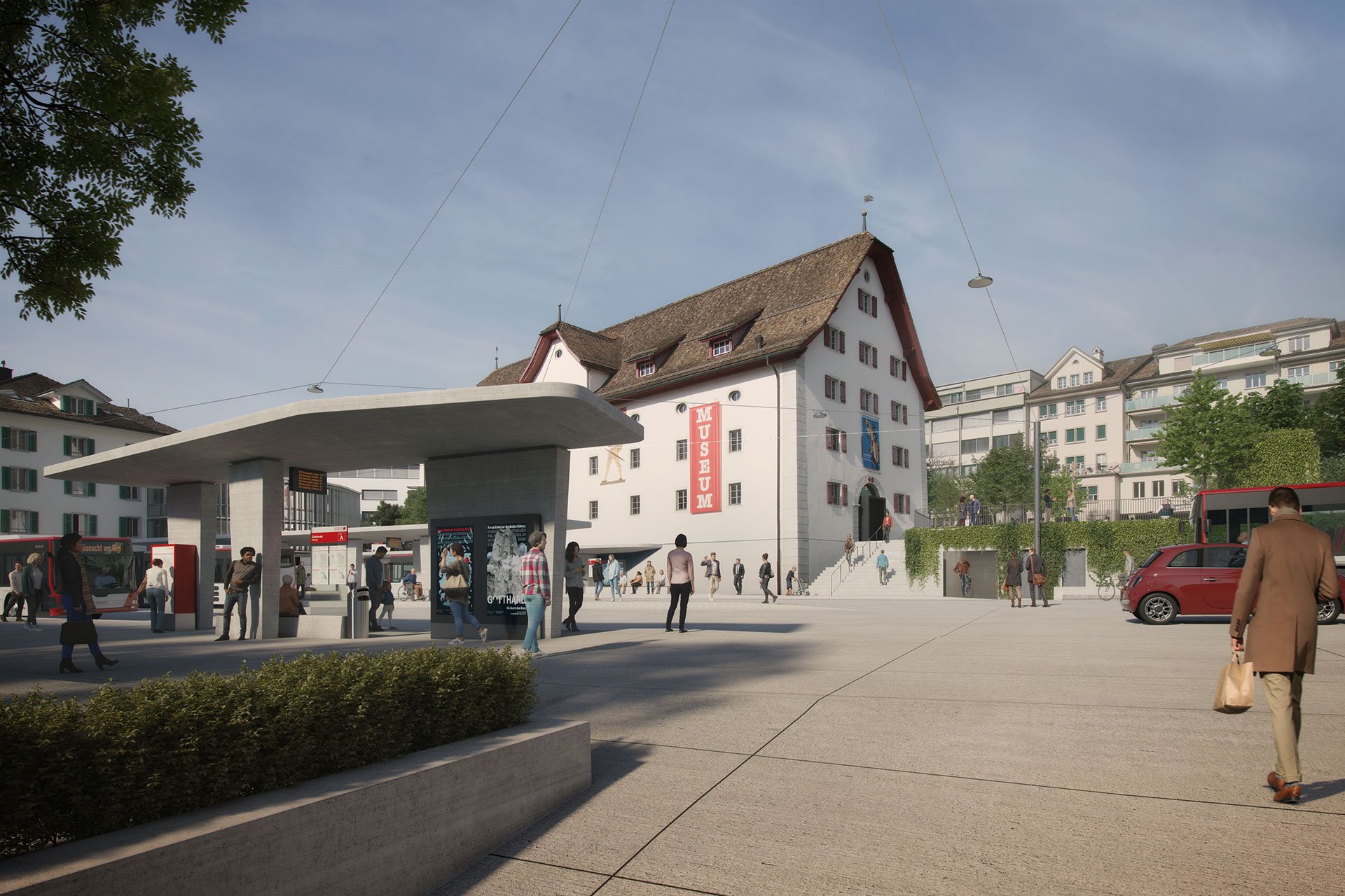 Der grosszügige Platz umgibt das bestehende Museum Forum der Schweizer Geschichte. Das Museum als zentrales Element auf dem Platz wird durch das begehbare Sockelgeschoss Teil des Platzes. Auf der Nordseite wird durch ein Baumdach ein vielseitig nutzbarer Aufenthalts- als auch Gastronomiebereich geschaffen, wohingegen der zentrale Platz für Nutzungen wie Markt oder Veranstaltungen freigehalten wird. Eine Kante trennt den Platz funktional vom Busbahnhof, lässt ihn visuell als Ganzes erfahrbar werden. Durch die Differenzierung der Beläge wird die unterschiedliche Funktion der Hofmatt und des Bushofes unterstrichen.