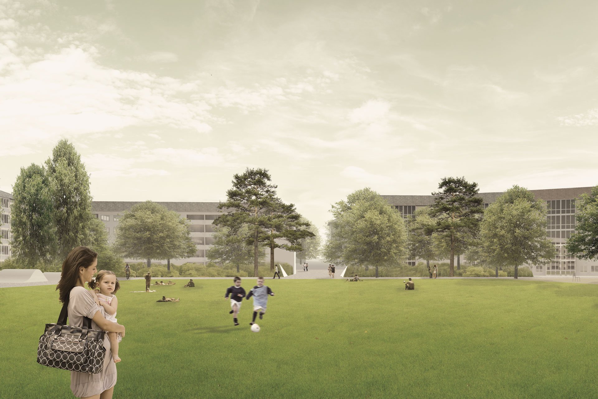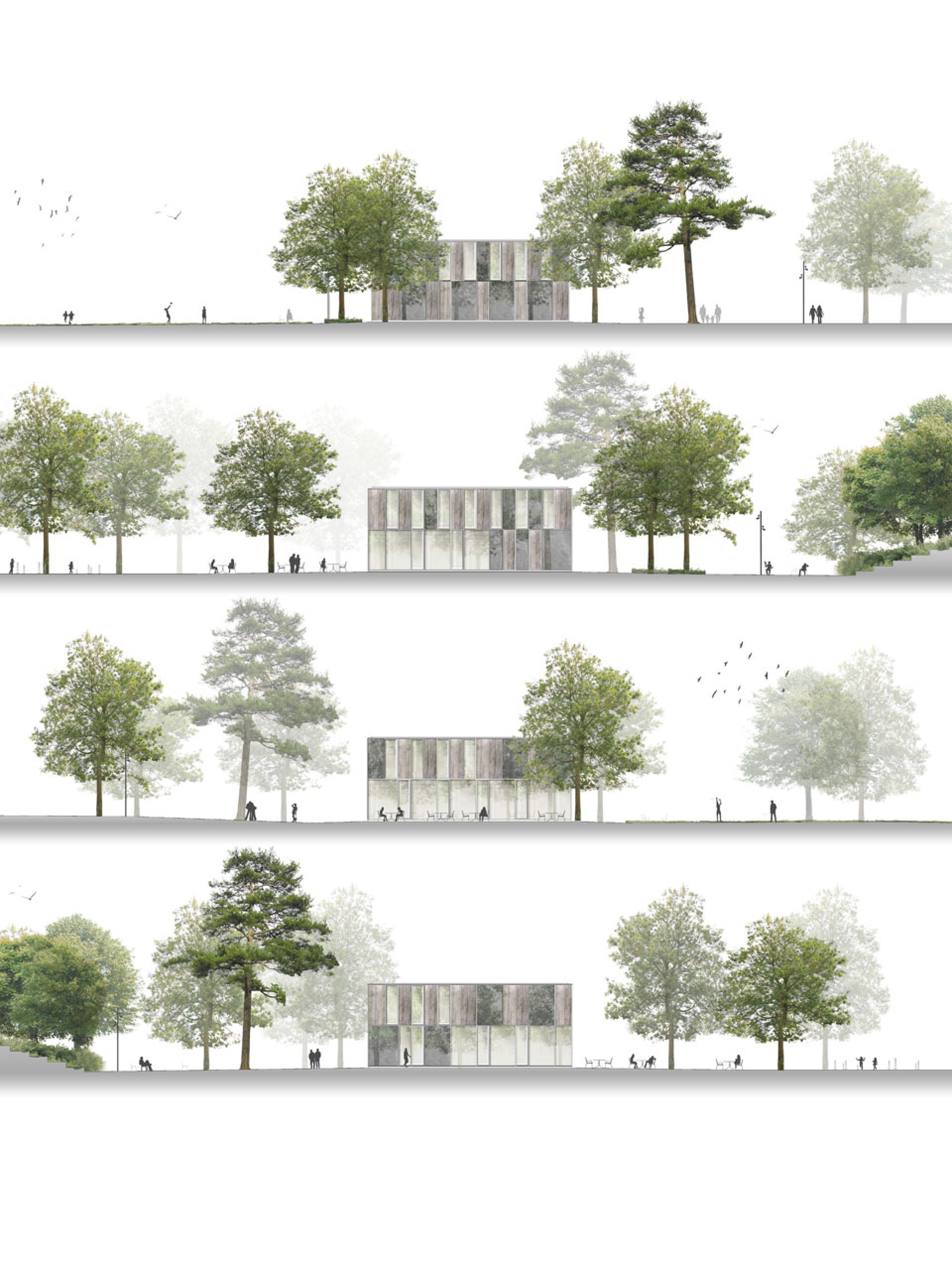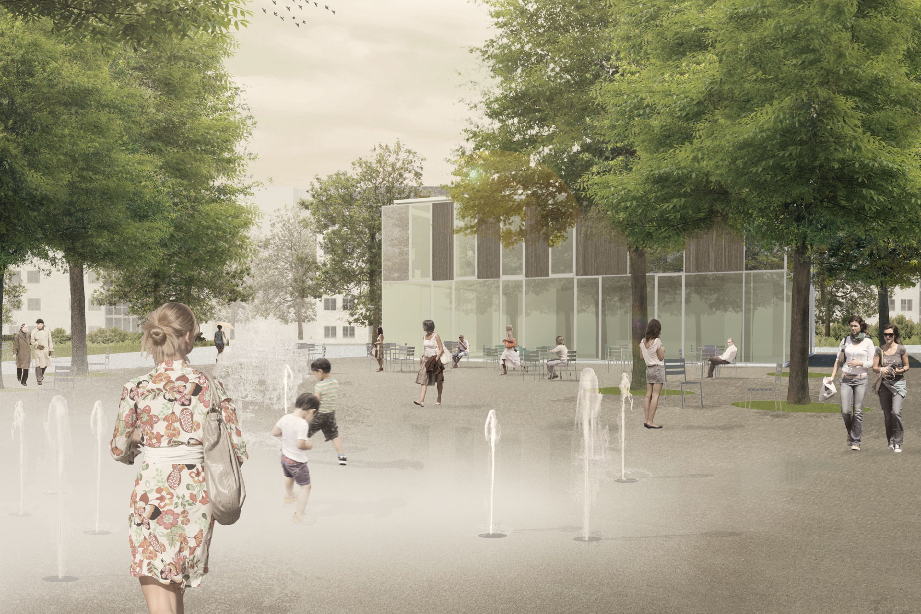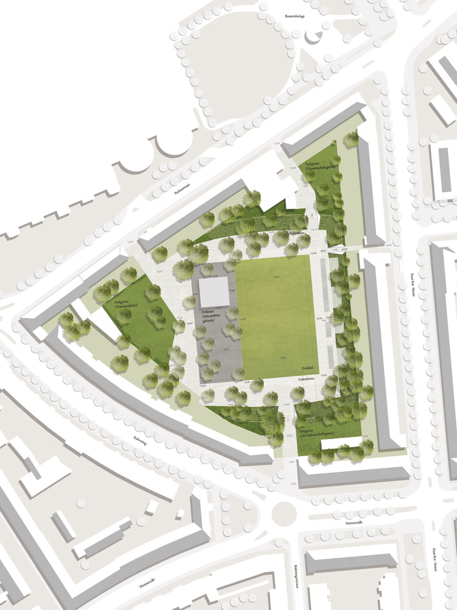 Ein klar umrissenes Parkfeld führt eine ordnende Dimension ein und schärft in seiner Setzung die Lesbarkeit des Ortes. Dabei formuliert sich eine Beziehung zwischen dem raumbildenden Blockrand und der quadratischen Grundform der hierarchisierenden Mitte. Im Wechselspiel von der stark bespielten Fläche zur ruhenden Leere, reflektiert das aufgespannte Feld mit seiner Nutzung die Geschichte und den Geist des Ortes.