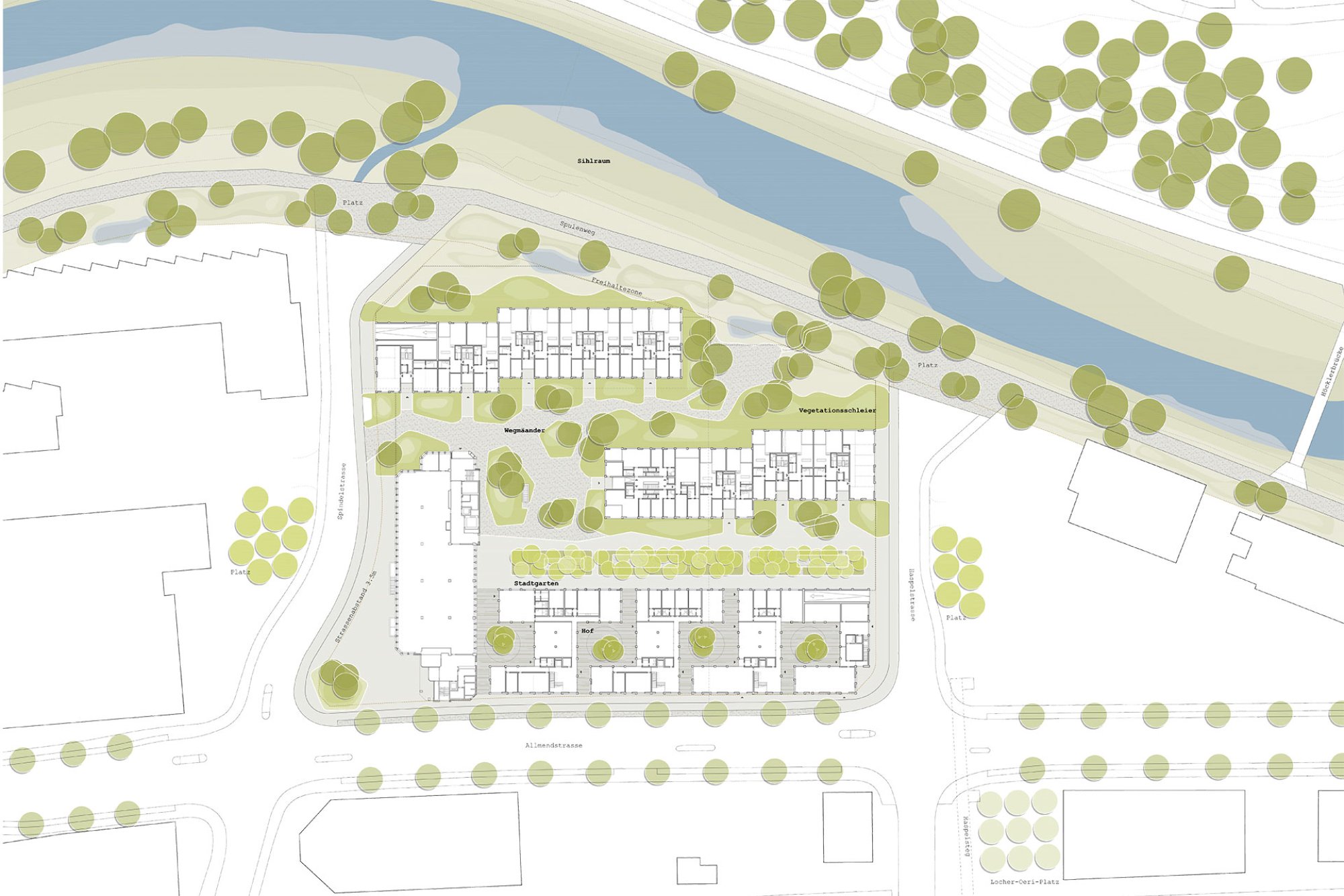 Für die Bauten am Sihlraum wird eine fliessende Raumkonzeption etabliert, die zum Uferbereich der Sihl einen kontinuierlichen Übergang entstehen lässt. Die Charakteristik des Sihlraumes wird hier zum bestimmenden Identitätsträger. Die ortstypische Ufervegetation wird in den Siedlungsraum geführt. Niedrige Weidenkörper umhüllen die Wohnbauten und bilden einen für die Erdgeschosswohnungen schützenden und für die Hauszugänge zugleich adressbildenden Vegetationsschleier. Grünflächen sind als Hochstaudenfluren oder Blumenwiesen, Wege und Platzflächen mit sickerfähigen Belägen ausgebildet. Zu den übergeordneten Freiraumachsen des Manegg-Gebietes wird über grosszügige Zugangssituationen angeknüpft.