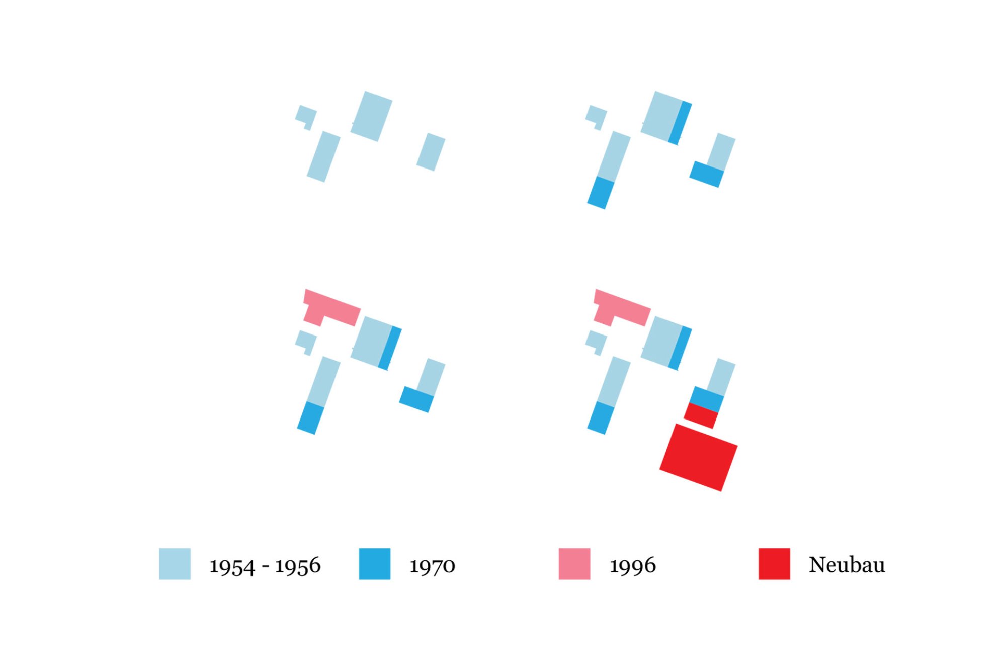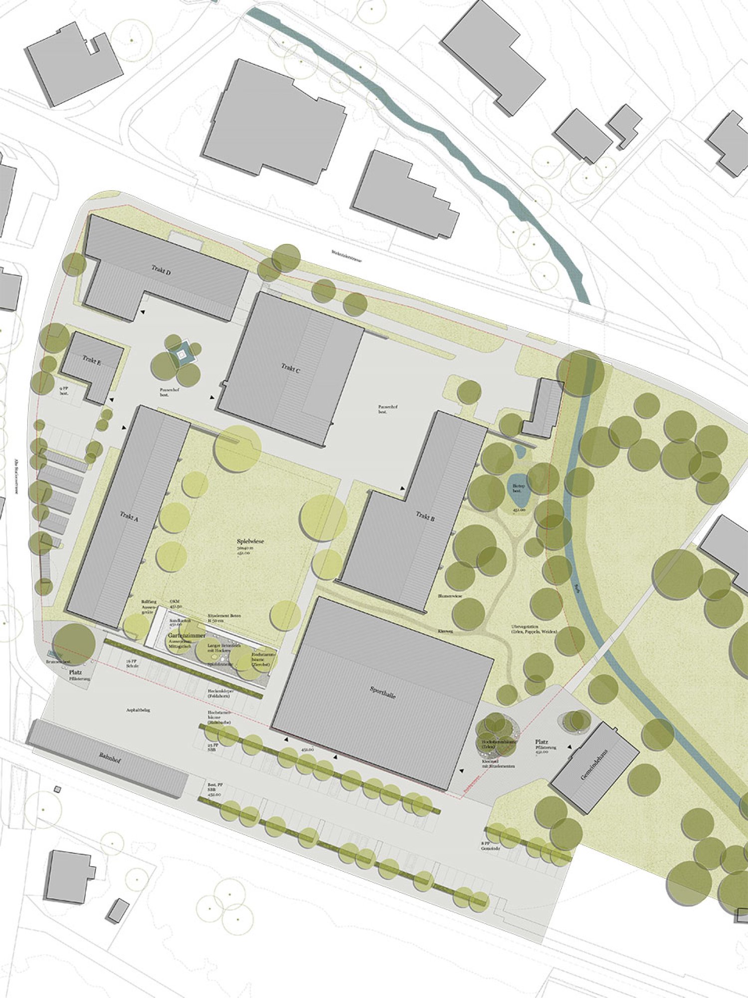 Lineare Heckenkörper und Hochstammbäume begrenzen das Schulareal zum Parkplatzbereich. Der bestehende Brunnen und die grosse Linde auf dem gepflästerten Platz schaffen einen Ankunftsort für Wartende, Pendler und Schüler.