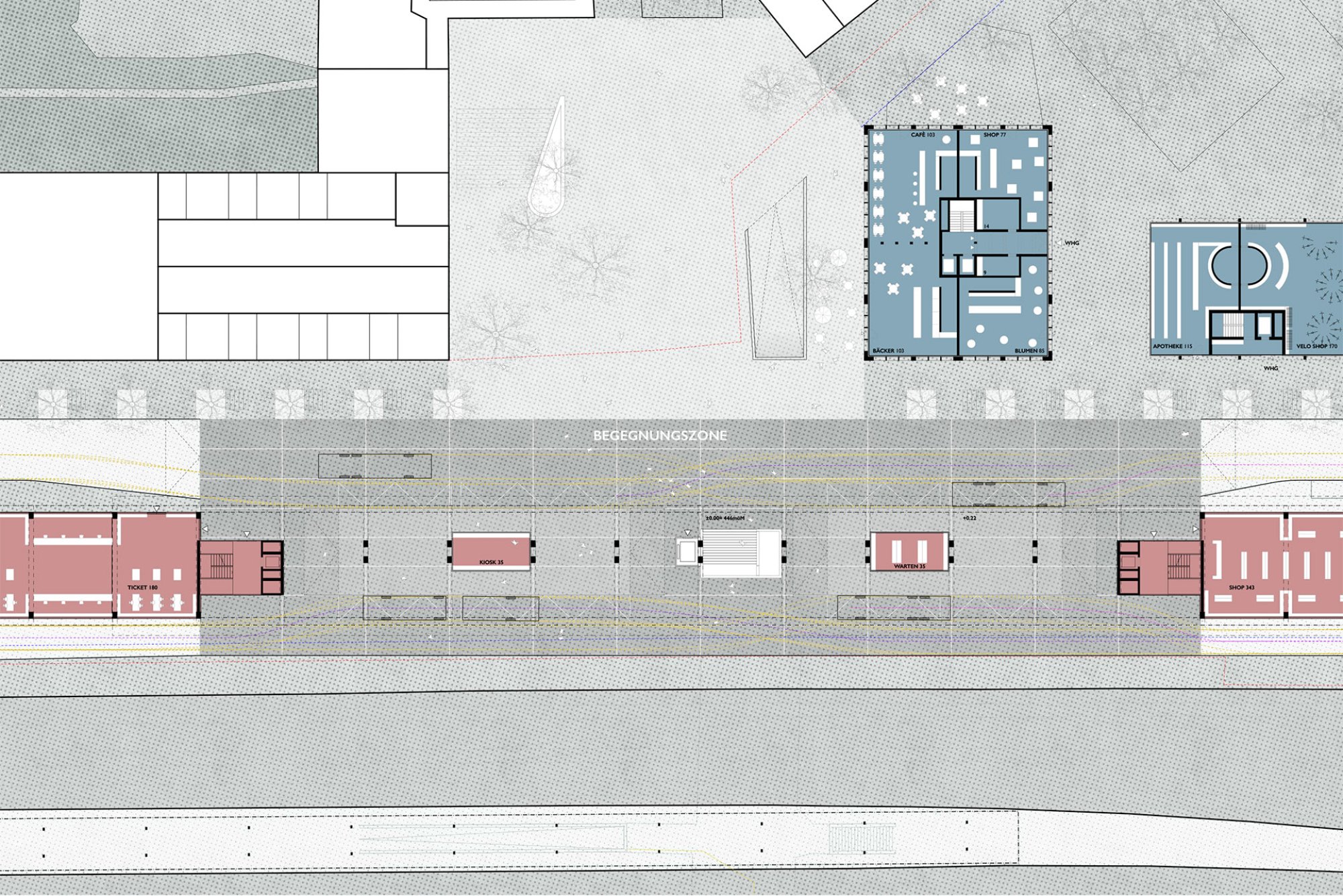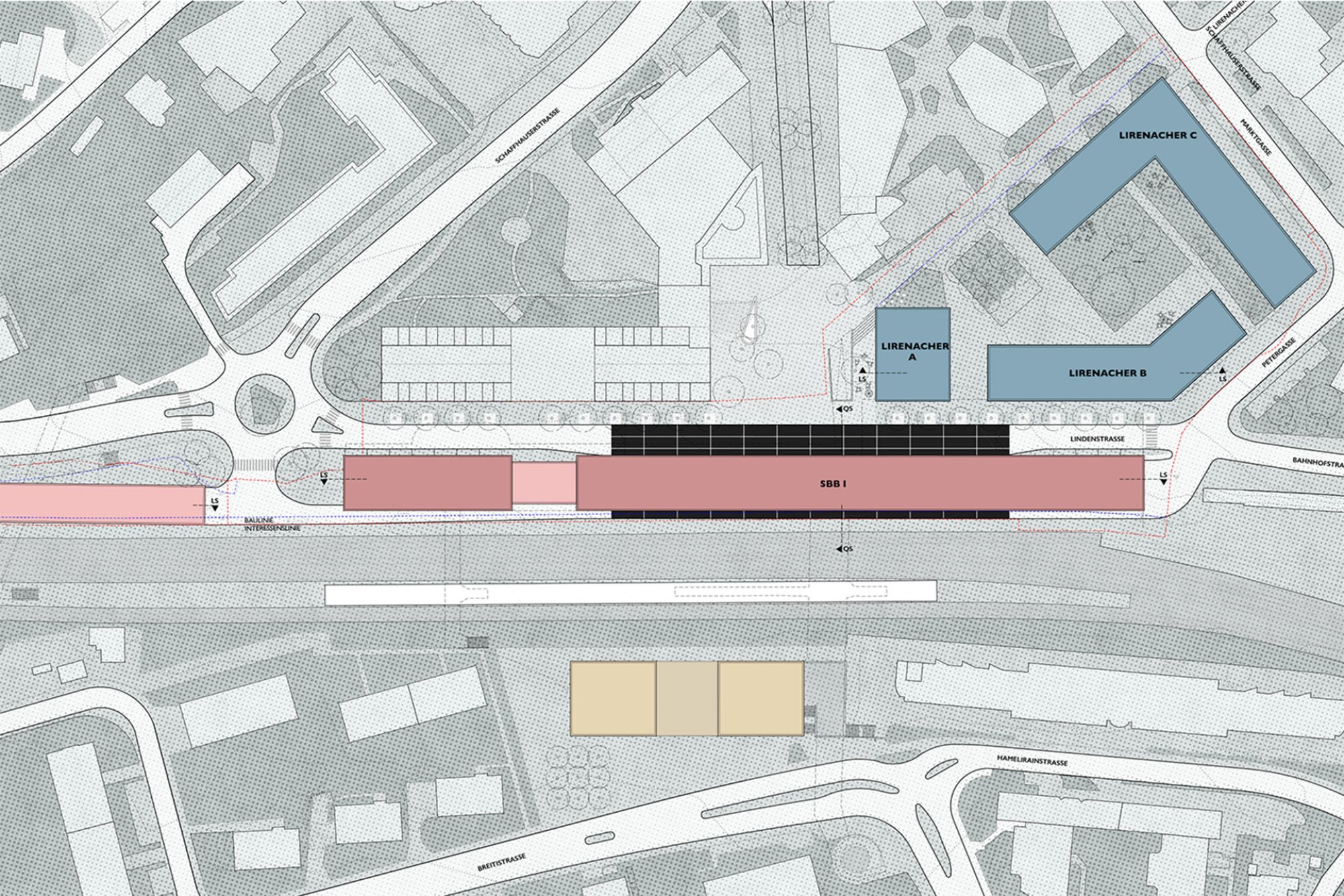 Die Verbindungen zwischen den Stadträumen werden aufgewertet und ihre Anknüpfungspunkte geklärt. Zusammen mit der Bebauung fügt sich der Bahnhofplatz Nord als adressbildende, städtebauliche Zäsur in die Strassenräume der Linden- und der Bahnhofstrasse ein. Eine klar umrissene Bodenplatte aus Ortbeton ist Funktionsträger für den Bushof und vermittelt zugleich als Begegnungszone zwischen den Anschlüssen.
