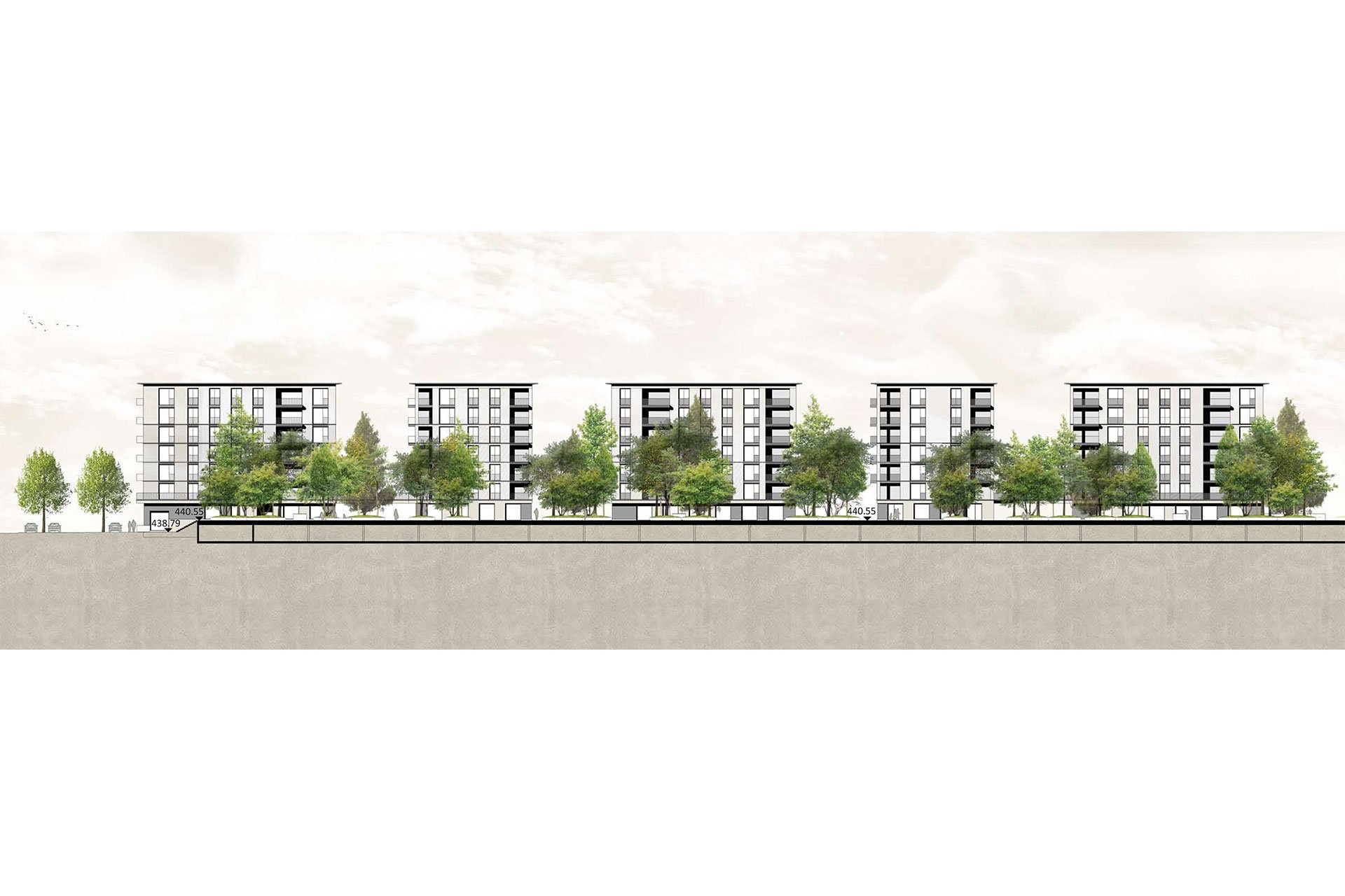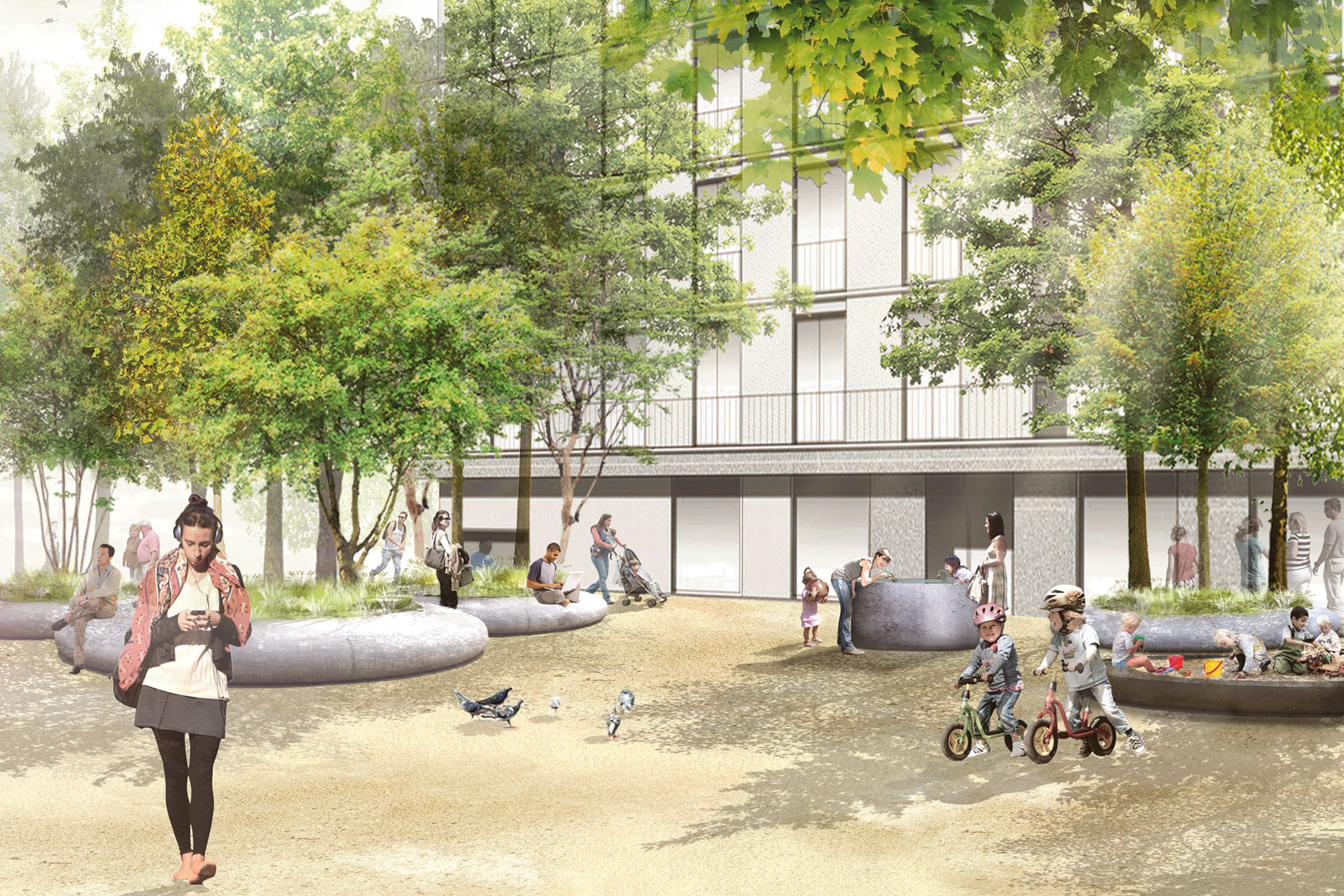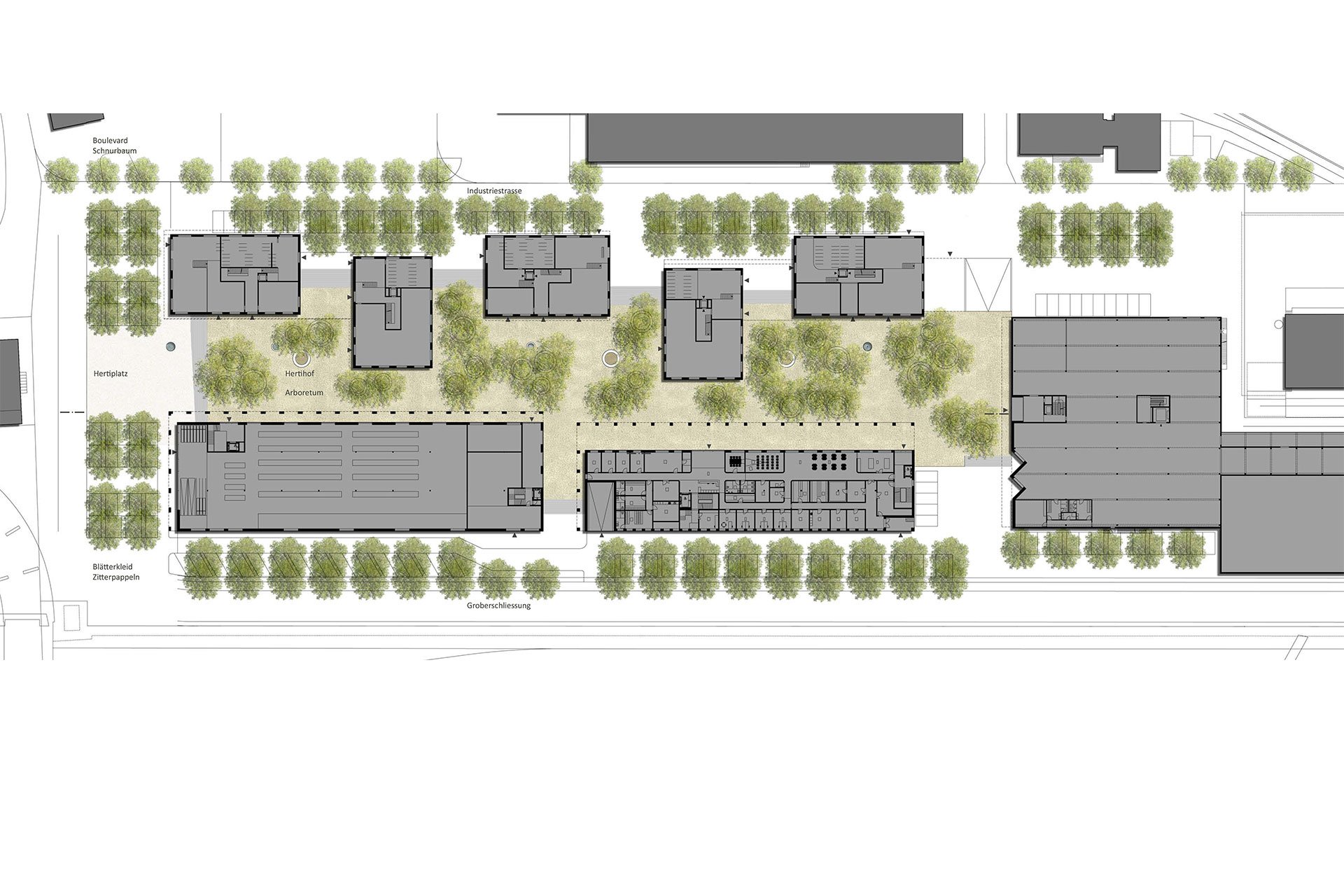 Eine Lagerung, beziehungsweise Sammlung, von über hundert unterschiedlichen Baumarten (Arboretum) aus Nord und Süd bildet das Herzstück des Hertiparkes und verleiht diesem eine starke Identität, eine grosse Aufenthaltsqualität und ein gutes Mikroklima für Wohnen und Arbeiten. Die grosse Diversität der Vegetation erzeugt unterschiedliche Atmosphären und variierende Hofbilder. In der Gesamtheit entsteht ein lichter Hain aus Laubgehölzen, Koniferen und immergrünen Bäumen, der Assoziationen an vergangene Reisen weckt. Die Bäume wachsen in skulptural geformten Baumkissen, welche mit verschiedenen Brunnen und Kinderspielbereichen ein lebhaftes Ensemble zwischen den Gebäuden bilden. Hochstammbäume aus einer Baumart kontrastieren die vielfältige Vegetation im Hof und bilden einen homogenen, grünen Rahmen für die Bebauung des Hertiparkes.