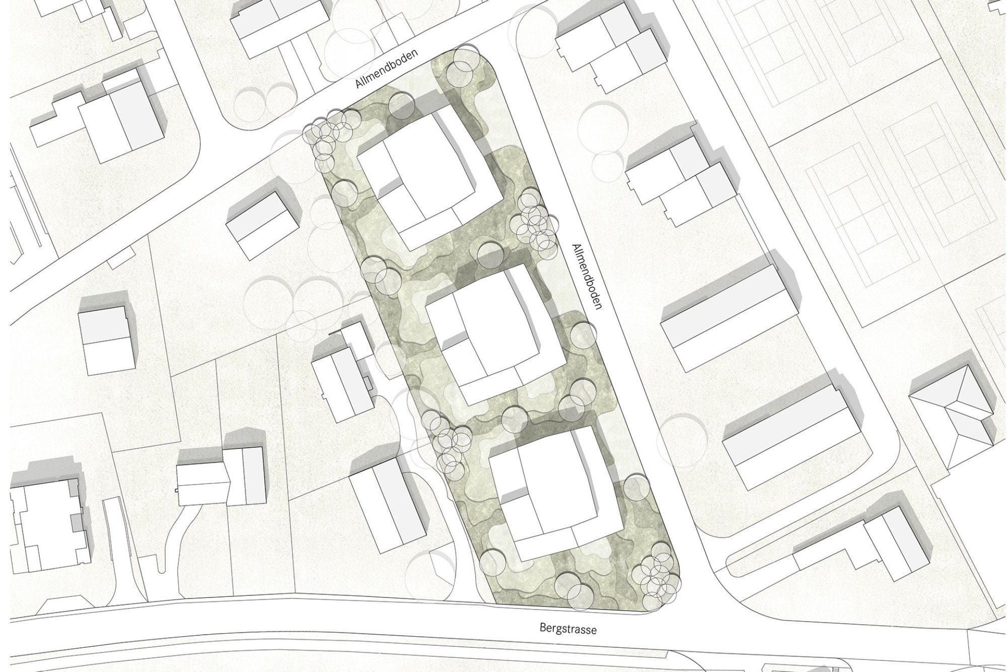 Wald, Streuobstwiesen und Weizenfelder werden bildhaft in die Gestaltung einbezogen und in kultivierter Form zu einer sinnlichen Gartenlandschaft komponiert. Das daraus abgeleitete Vegetationskonzept fügt sich mit einer weich verlaufenden Topografie zu einer fliessenden Raumkonzeption zusammen. Diese bettet die Bauten in einen gemeinsamen Garten ein, bildet räumlich gefasste Vorplätze mit repräsentativen Adressen und attraktive, geborgene Aussenräume für die Gartengeschosswohnungen.