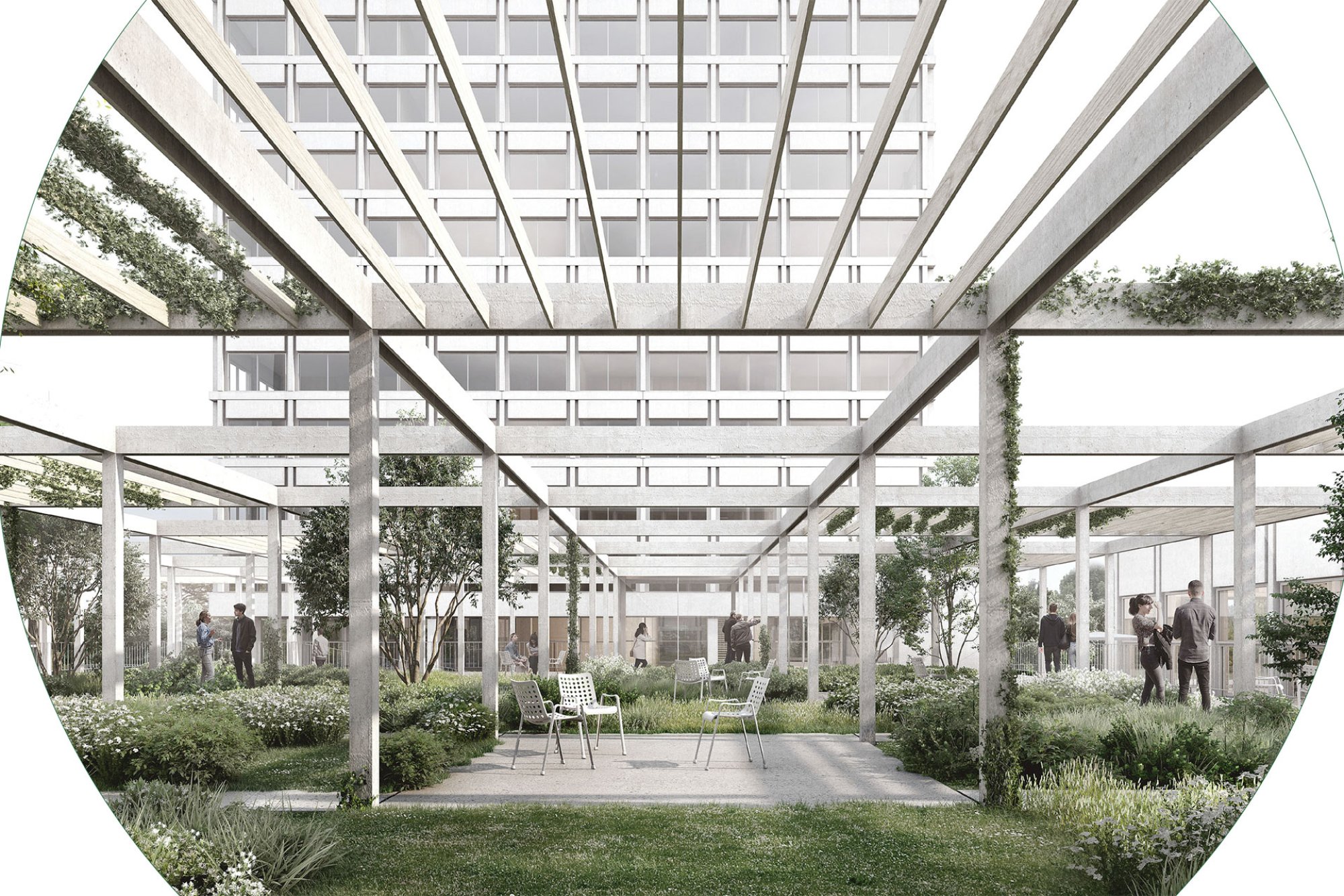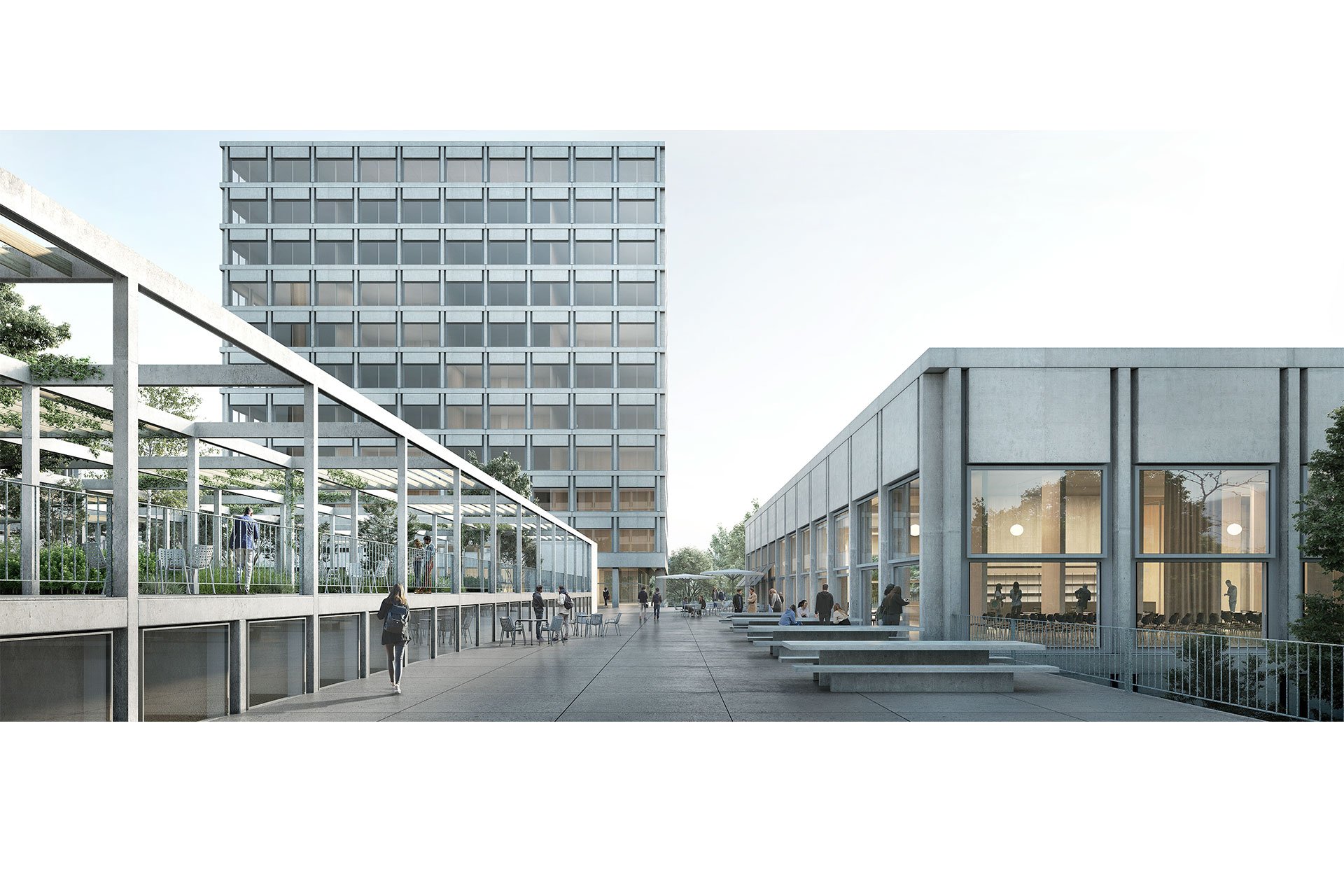 Die Freiraumgestaltung baut auf dem orthogonalen städtebaulichen Muster auf und verankert den Campus über unterschiedliche Freiraumtypologien im Kontext.