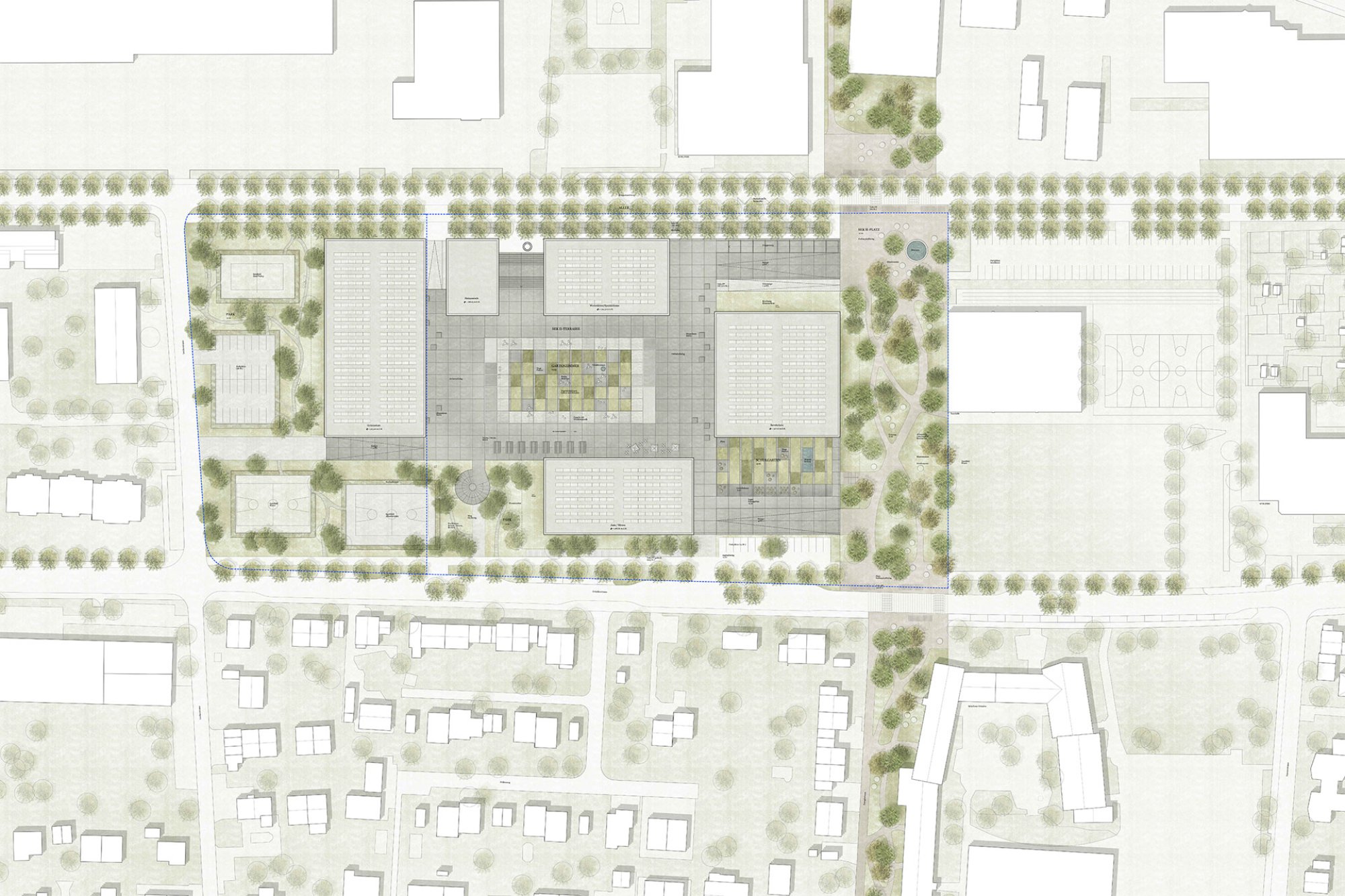In den Park eingeschriebene Heckengevierte stricken das geometrische Muster, als von aussen in Erscheinung tretende Grünvolumen fort und rahmen die Spielfelder und den Besucherparkplatz. Eine dreireihige Baumallee erweitert den Boulevard an der Kriegackerstrasse auf die gesamte Länge der Anlage und führt diesen als adressbildenden Ankunfts- und Aufenthaltsraum bis an die Schulbauten. Als räumliche Zäsur im Boulevard ausformuliert, verwebt sich der Sek II-Platz mit dem Wegstrang des übergeordneten Grünzuges und wirkt an dieser Stelle als Auftakt mit Hauptzugang auf die Sek II-Terrasse. Betonplatten knüpfen dort über ihr Format an das Stützenraster der Schulbauten an und verbinden diese in der Form einer offenen Platzfläche. Abgesetzt und in die dritte Dimension geformt, bieten ein Gartenzimmer und der Schulgarten geborgene Grünräume für Aufenthalt und Unterricht.