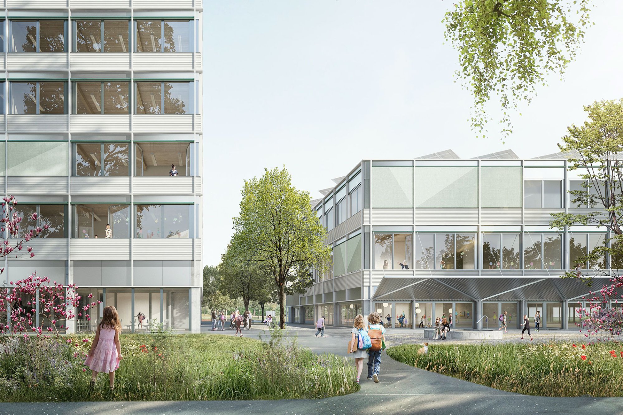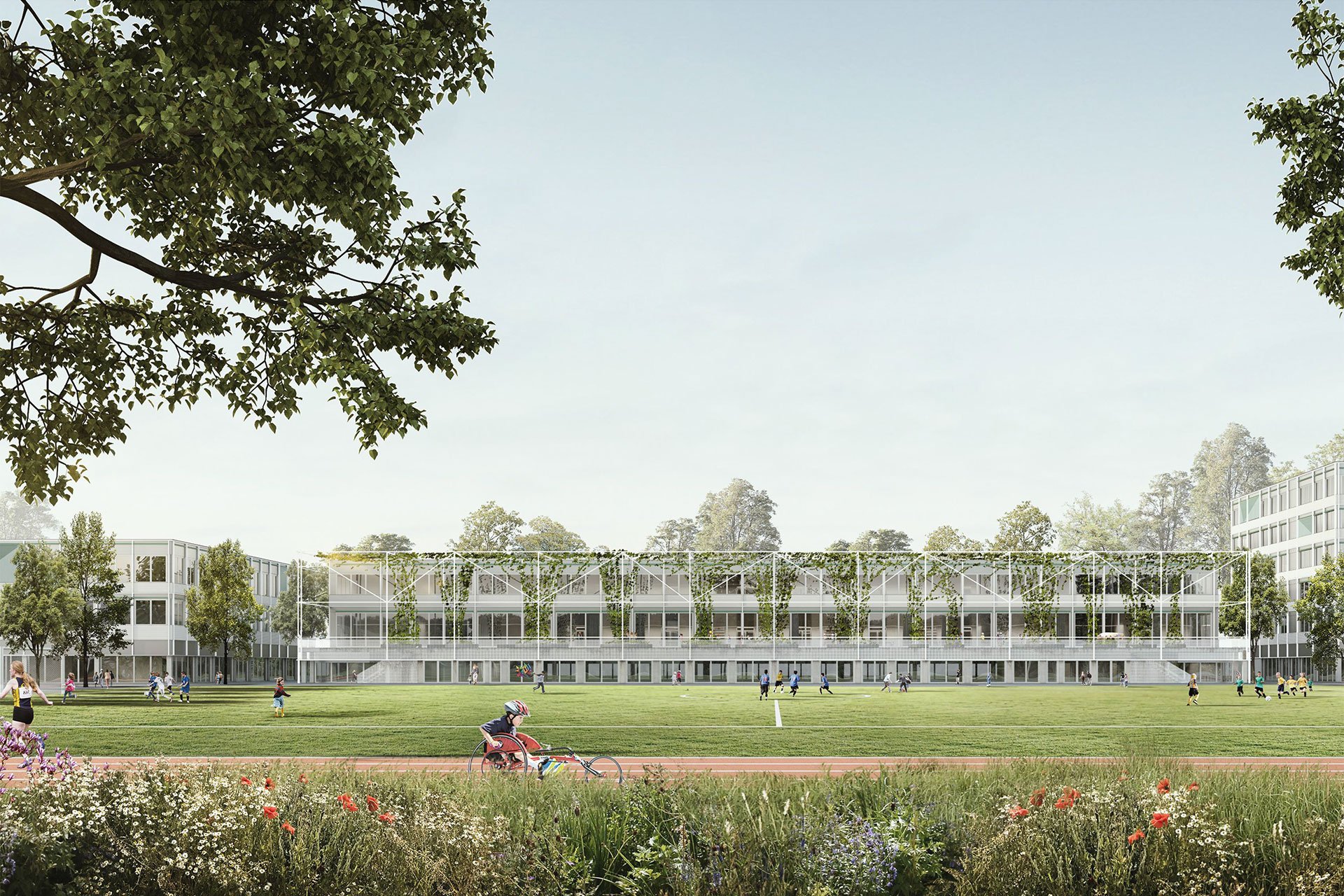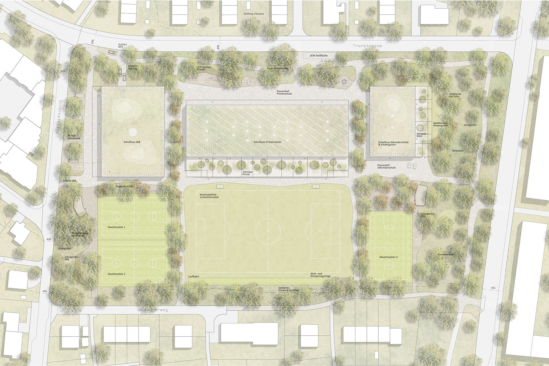 Um die Anbindungen an die umliegenden Quartiere aus möglichst vielen Richtungen zu gewährleisten, schlängelt sich ein Fuss- und Radweg mit diversen Anbindungspunkten durch den Grüngürtel und um das Gesamtareal. Inmitten dieses grünen Rahmens liegen mit weichen Kanten ausgebildete Spielfelder. Auf den Pausenhöfen entstehen als Schattenspender und Aufenthaltsbereiche lockere Baumhaine bestehend aus schirmförmigen Ziergehölzen. Diese Bereiche wirken als Bewegungsfilter zwischen Schul- und Sportanlage und können vielfältig bespielt werden.