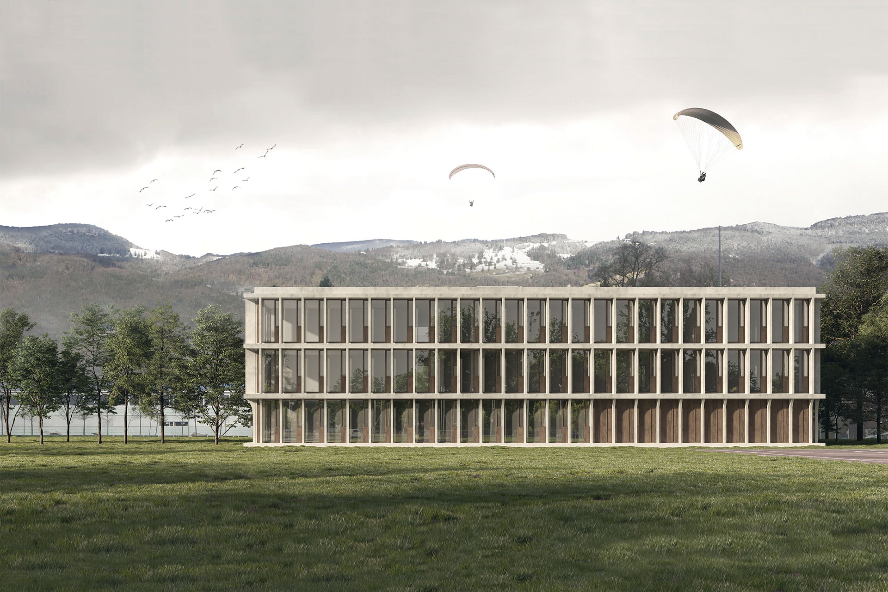 Die grosszügige Platzfläche zwischen Schulhaus Carpe Diem, Dorfhalle und neuem Schulhaus bleibt durch die städtebauliche Setzung als offener und multifunktionaler Platz erhalten, verbindet die Gebäude miteinander und schafft einladende Adressen am Chäsiweg. Die zentrale Platzfläche bietet ein vielfältiges Angebot für Bewegung und Sport und wird durch lineare Dächer mit Velo- und Kickboardstellplätzen, sowie gedeckten Aussenbereichen im Osten abgeschlossen.