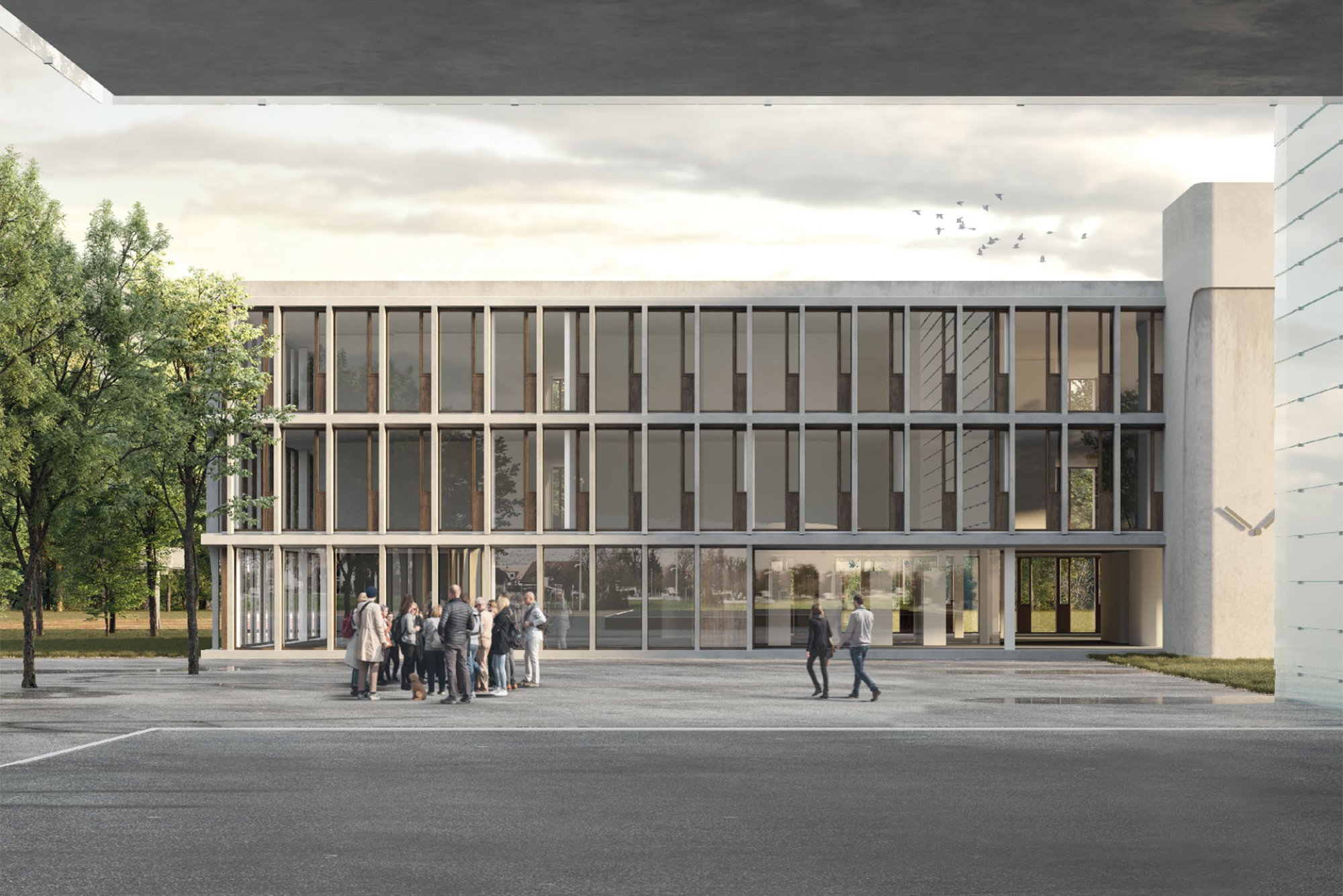 Ein Baumdach aus hochstämmigen Laubbäumen fügt sich als klar umrissenes Baumvolumen in die offene Platzfläche ein. Ausgestattet mit bestehendem Wasserbecken und Sitzbänken etabliert ein Kiesfeld einen attraktiven und beschatteten Treffpunkt mit Aufenthaltsqualität.
