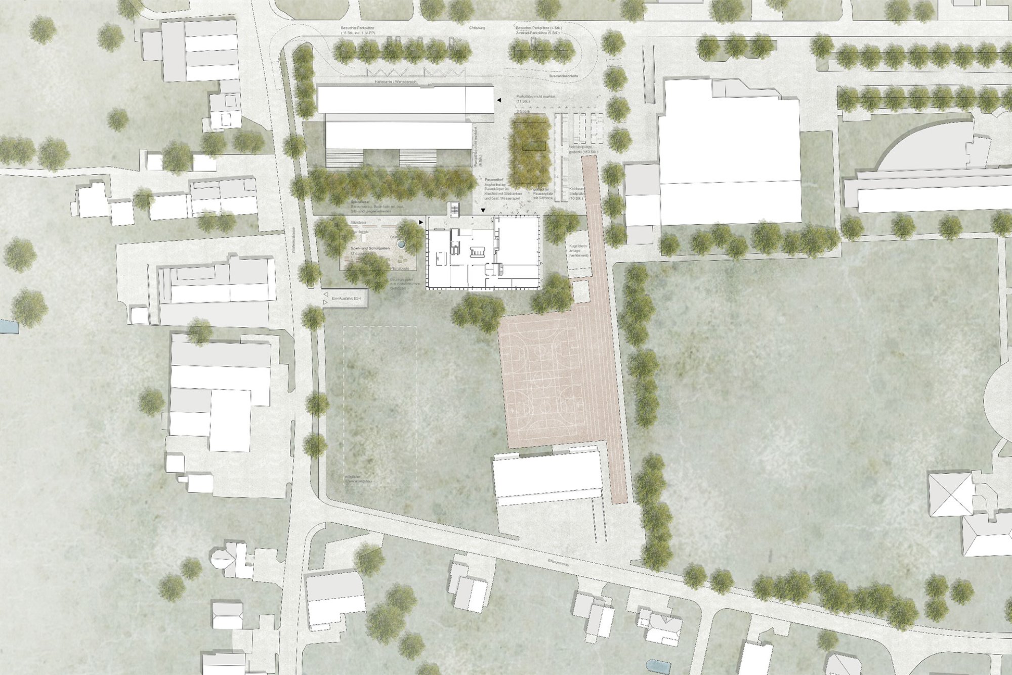 Angedockt an den Platz, liegt das Schulhaus im Grünen und ist umgeben von einem vielfältigen Spiel- und Sportraum. Heimische Gehölze stricken den Bestand zu locker stehenden Baumgruppen weiter. Im Westen des Neubaus, fügt sich der Spiel- und Schulgarten als erweiterter Pausenplatz in die Wiesenfläche ein. Mit einem Brunnen, Sitz- und Spielmobiliar bestückt, bietet sich ein geschützter Ort für Pausen oder den Unterricht im Grünen. Eine Mischung aus schattenspendenden Hochstammbäumen durchsetzt die chaussierte Fläche und akzentuiert in Gruppen den Raum.