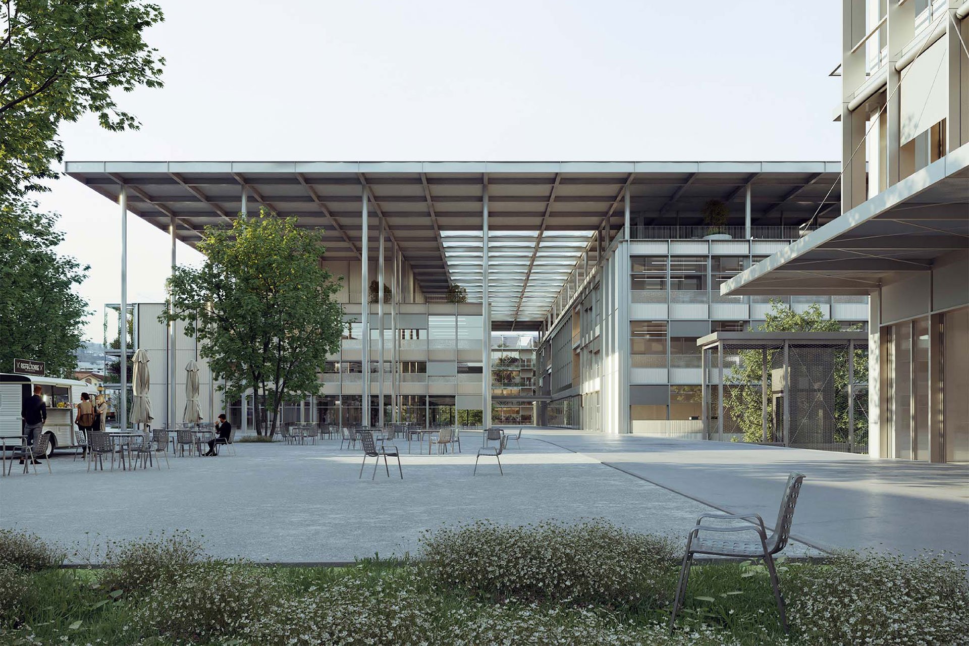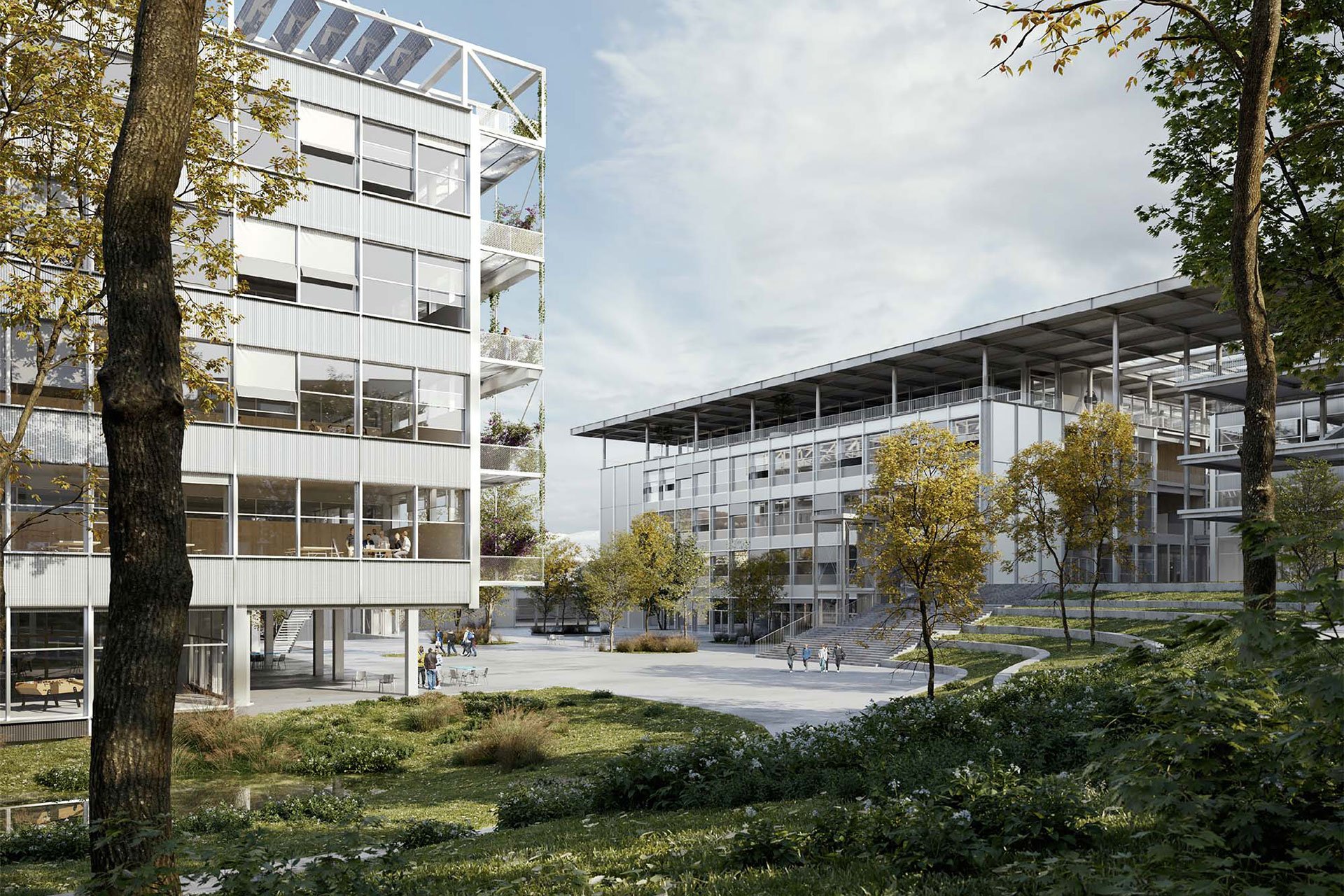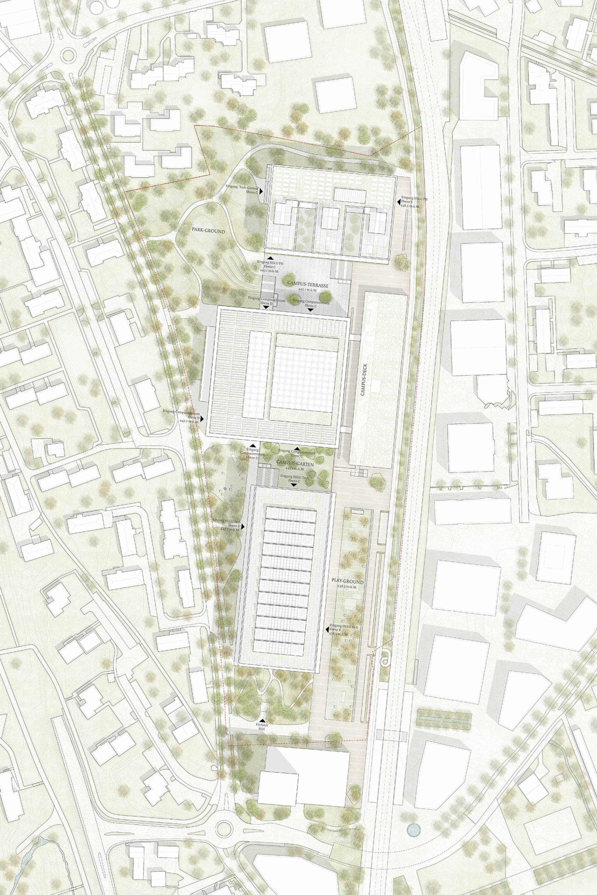 Eingespannt zwischen der Technikumstrasse und den Bahngleisen entstehen mit Bezug auf den Kontext zwei Freiraumtypologien mit unterschiedlichen Nutzungsangeboten und Qualitäten; der Park-Ground und der Play-Ground. Zwischen den Gebäuden definieren sich Zwischenräume, die das Freiraumangebot des Campus ergänzen; der grüne Campus-Garten, die Campus-Höfe und die offen gestaltete Campus-Terrasse. Das Campus-Deck auf dem Dach des bestehenden Trakt 1 ergänzt den Aussenraum in Form eines geschützten Dachgartens.