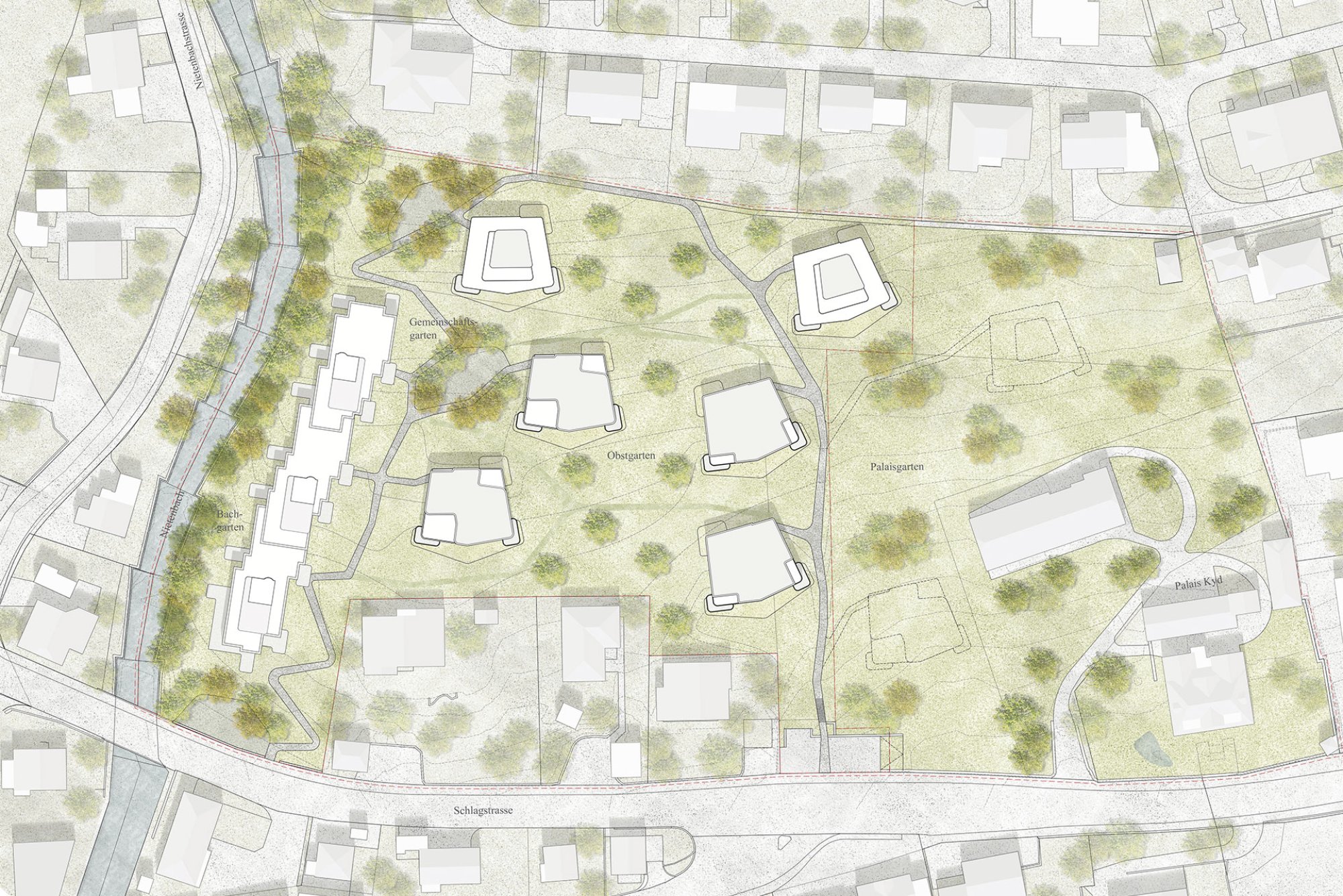 Der Obstgarten bietet Raum zum Atmen und mit seinem schützenden Baumschleier aus Zierobstbäumen umhüllt er die Gebäude und ist ein prägendes vegetatives Merkmal der Siedlung. Im Palaisgarten können die bestehenden Strukturen des Palais Kyd fortgeführt werden und einen nahtlosen Übergang zu den Freiräumen der Überbauung Kappelmatt ermöglichen.
