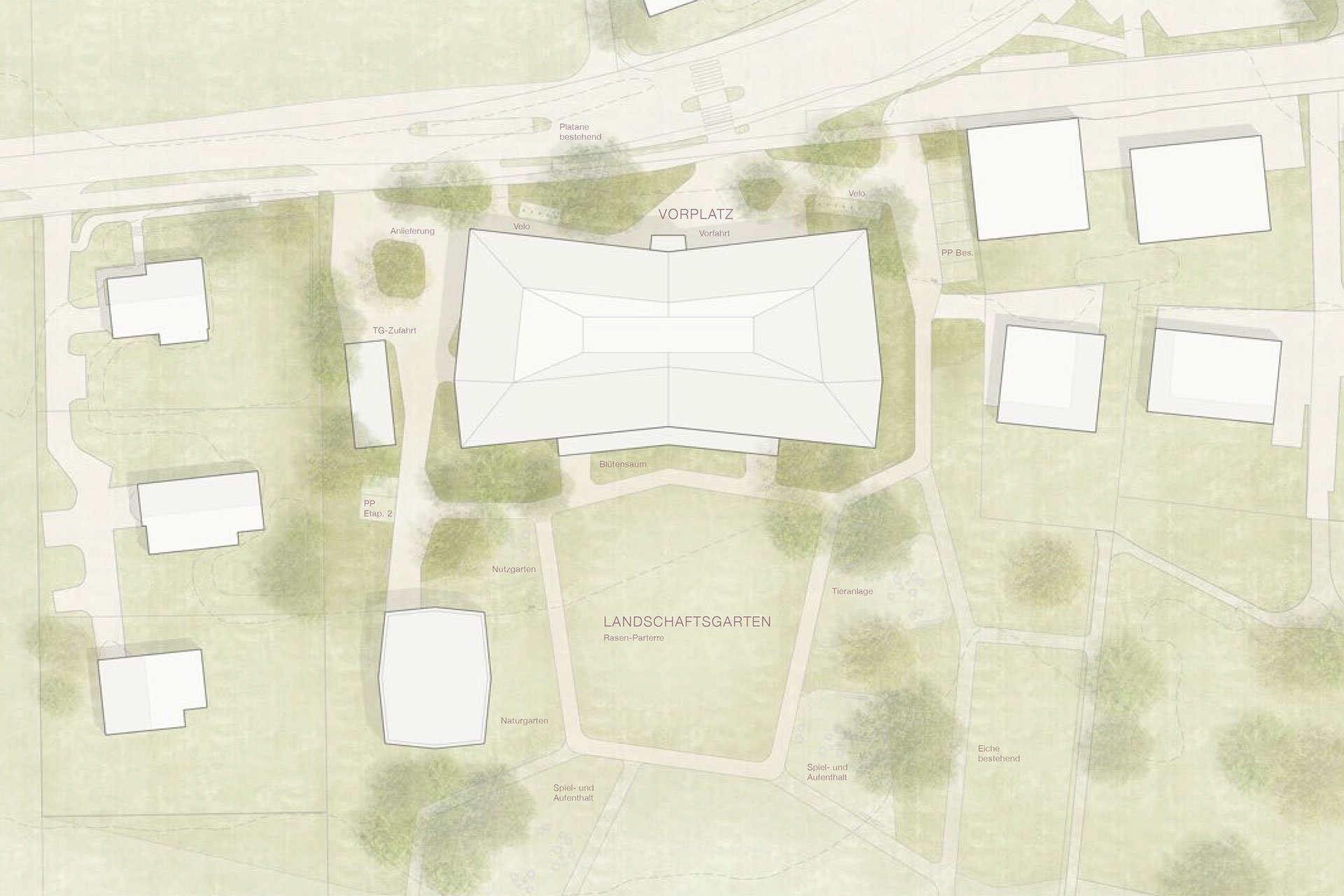 Ein dichter Blütensaum umgibt die Gebäude, welcher zum See in einen Naturgarten und schliesslich in eine extensive Blumenwiese übergeht. Verschiedenartige Nutzungsinseln wie Spiel- und Aufenthaltsbereiche, ein Aussenbereich für Tieranlagen und ein Nutzgarten sind in den Landschaftsgarten integriert. Von der Seeterrasse kann über die offene Mitte, das Rasen-Parterre, bis in die Ferne geblickt werden. Baumgruppen aus einheimischen Gehölzen strukturieren den Garten und schaffen Blickbeziehungen und Sichtachsen zum See und in die Berge. Vielfältige Rundwege bilden einen fliessenden Übergang zur angrenzenden Seeanlage und regen zum Spazieren und Aufenthalt im Garten an. Der Landschaftsgarten wird zum attraktiven Ort für die Bewohner und die Öffentlichkeit.