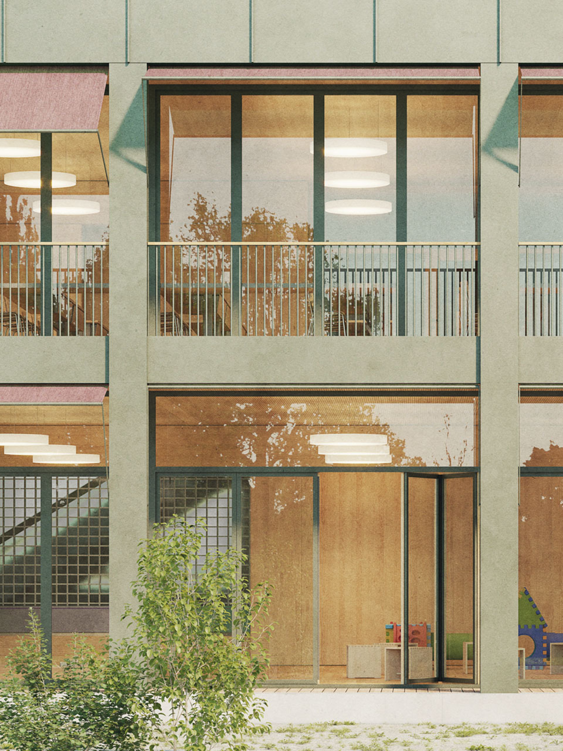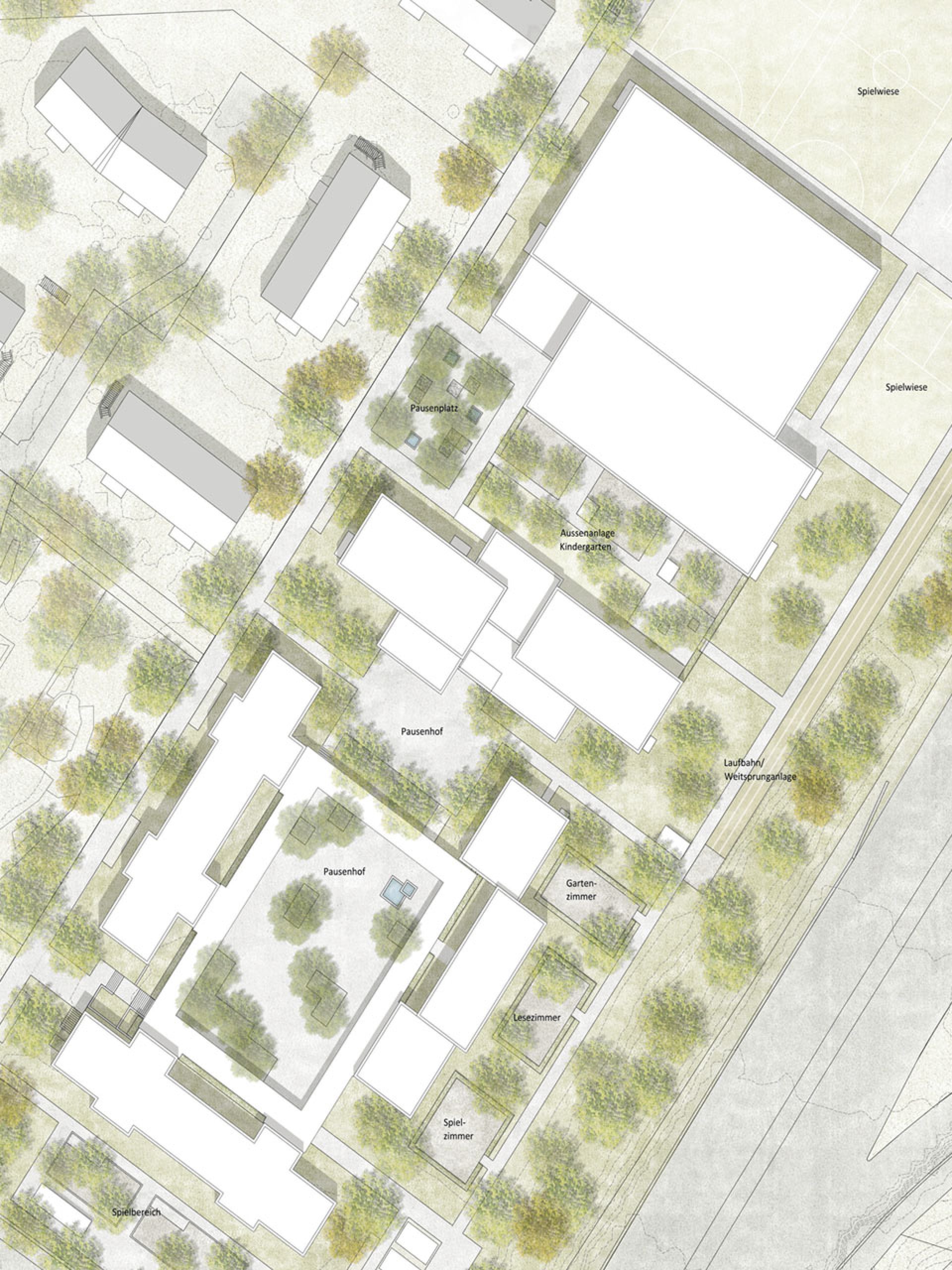 Baumsetzungen aus einheimischen Hochstammbäumen sticken den Baumbestand des Areals weiter, strukturieren den Freiraum und lassen unterschiedlich atmosphärische Aufenthaltsräume entstehen. Konzentrationen der gleichen Baumart in Gruppen und Hainen prägen die Identitäten der einzelnen Bereiche. Das gesamte Areal wird durch einen dichten grünen Rahmen aus bestehenden und neuen Bäumen gesäumt und somit zu den angrenzenden Wohngebieten und der Autobahn abgegrenzt.