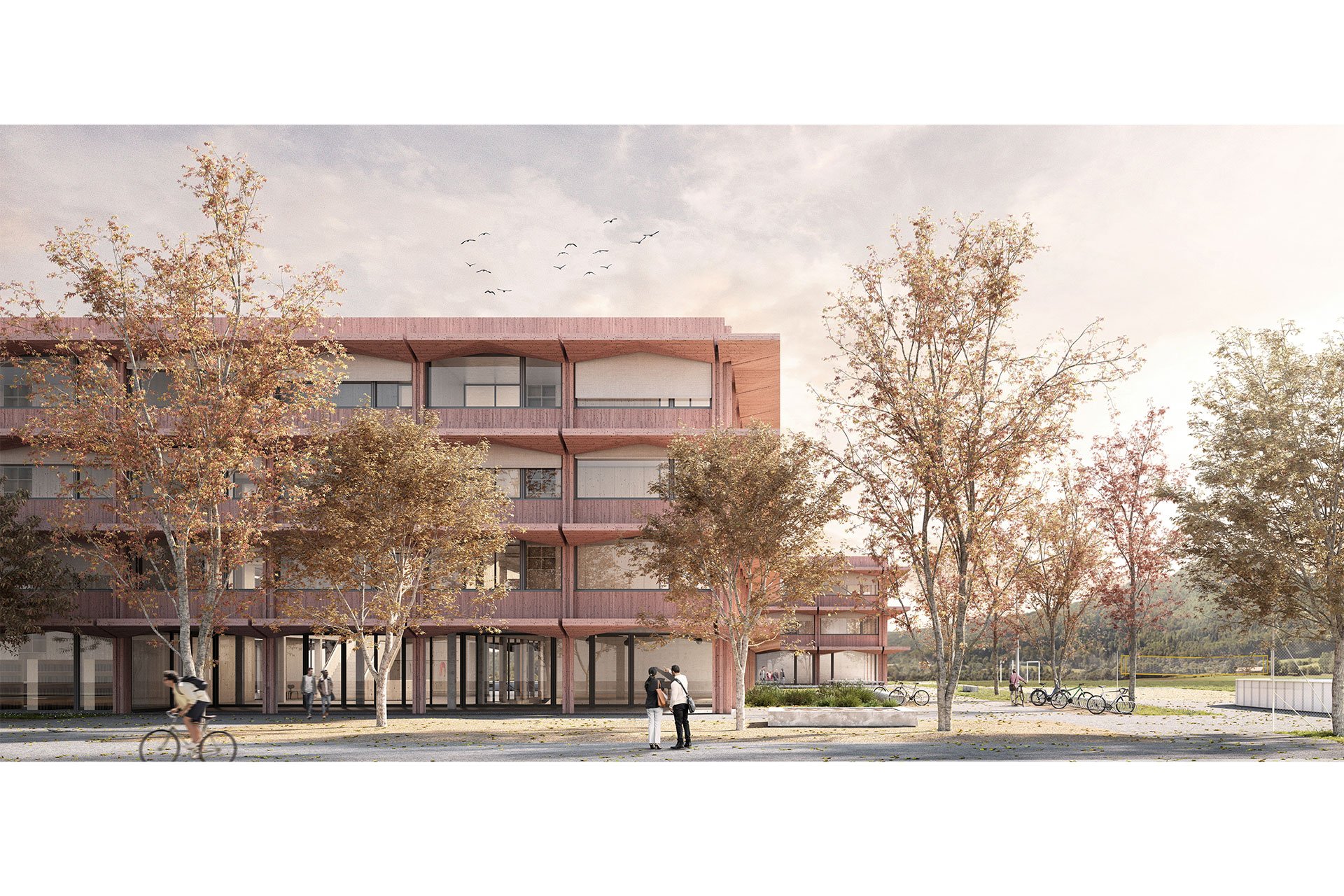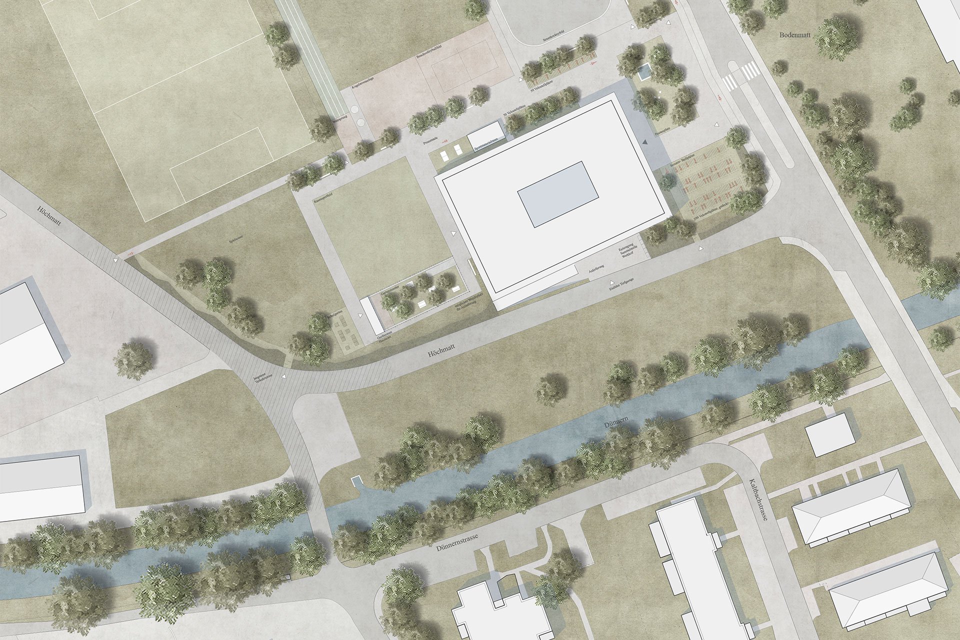 Angedockt an den Platz, liegt das Schulhaus im Grünen und ist umgeben von einem vielfältigen Aufenthalts-, Spiel- und Sportraum. Ein Gartenzimmer mit Rasenspielfeld ergänzt das Angebot und bietet einen gerahmten Rückzugsraum. Mit Sitz- und Spielmobiliar bestückt, bietet sich ein geschützter Ort für Pausen oder den Unterricht im Freien. In Verlängerung des Gartenzimmers fügt sich ein Schulgarten in die Raumkonzeption ein. Den räumlichen Abschluss bildet die grosszügige Spielwiese. Freiwachsende Heckenkörper und Hochstammbäume begrenzen das Schulareal zum Strassenraum. Ein durchgehender Fuss- und Veloweg zwischen Aussensportfelder und Neubau schliesst an bestehende Knotenpunkte an und verbindet die Nutzungen zu einem Campus. Neue Wegeverbindungen zur Raiffeisenarena schaffen Durchlässigkeit, ermöglichen quartierübergreifende Verbindungen und ordnen die Schulanlage in den Kontext ein.