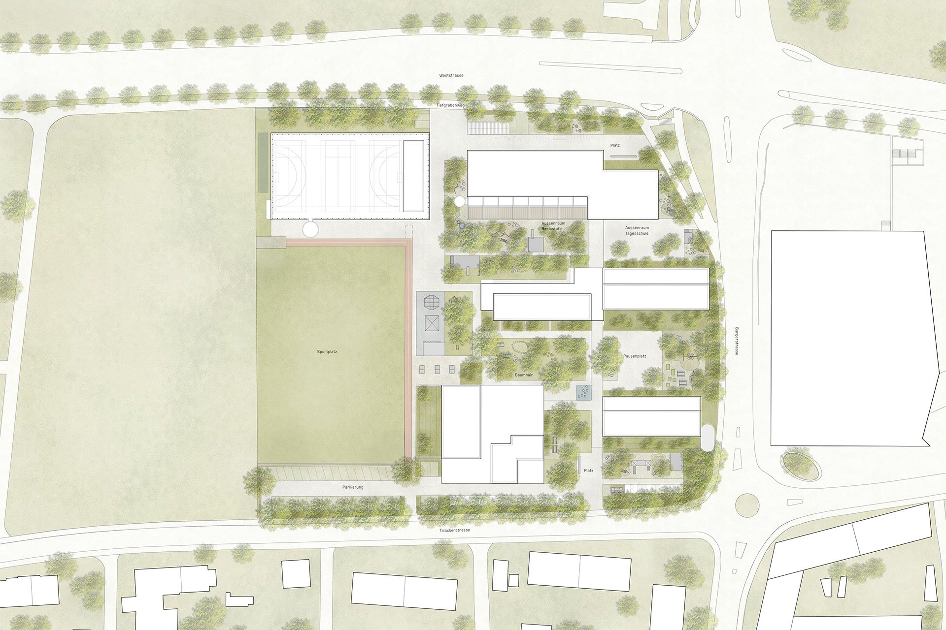 Ein rasterförmiges Wegenetz sorgt für eine direkte Erschliessung innerhalb des Perimeters und schliesst an vorhandene Knotenpunkte an und schafft eine klare Adressierung für das Schulareal. Zwei Platzaufweitungen markieren die Hauptzugänge auf das Areal. Die bestehenden Rasenflächen mit schattenspenden Baumhainen werden weitergeführt und als ruhige Aufenthaltsbereiche mit Sitzmöglichkeiten und Sitzkreisen ergänzt. Als aktivere Zonen stehen die kiesigen, naturnahen Bereiche und Hartbelagsflächen den Schülerinnen und Schülern zur Verfügung.