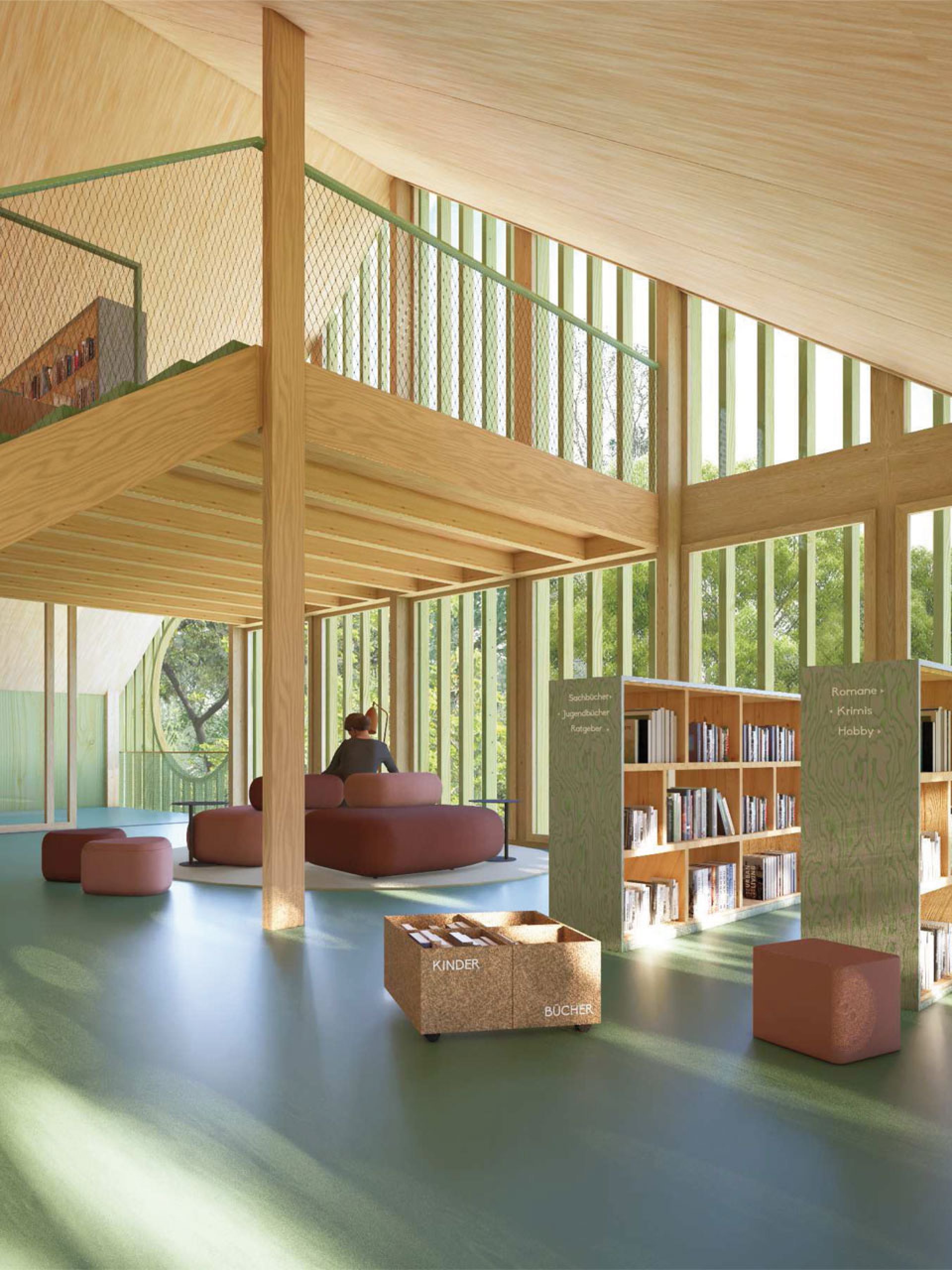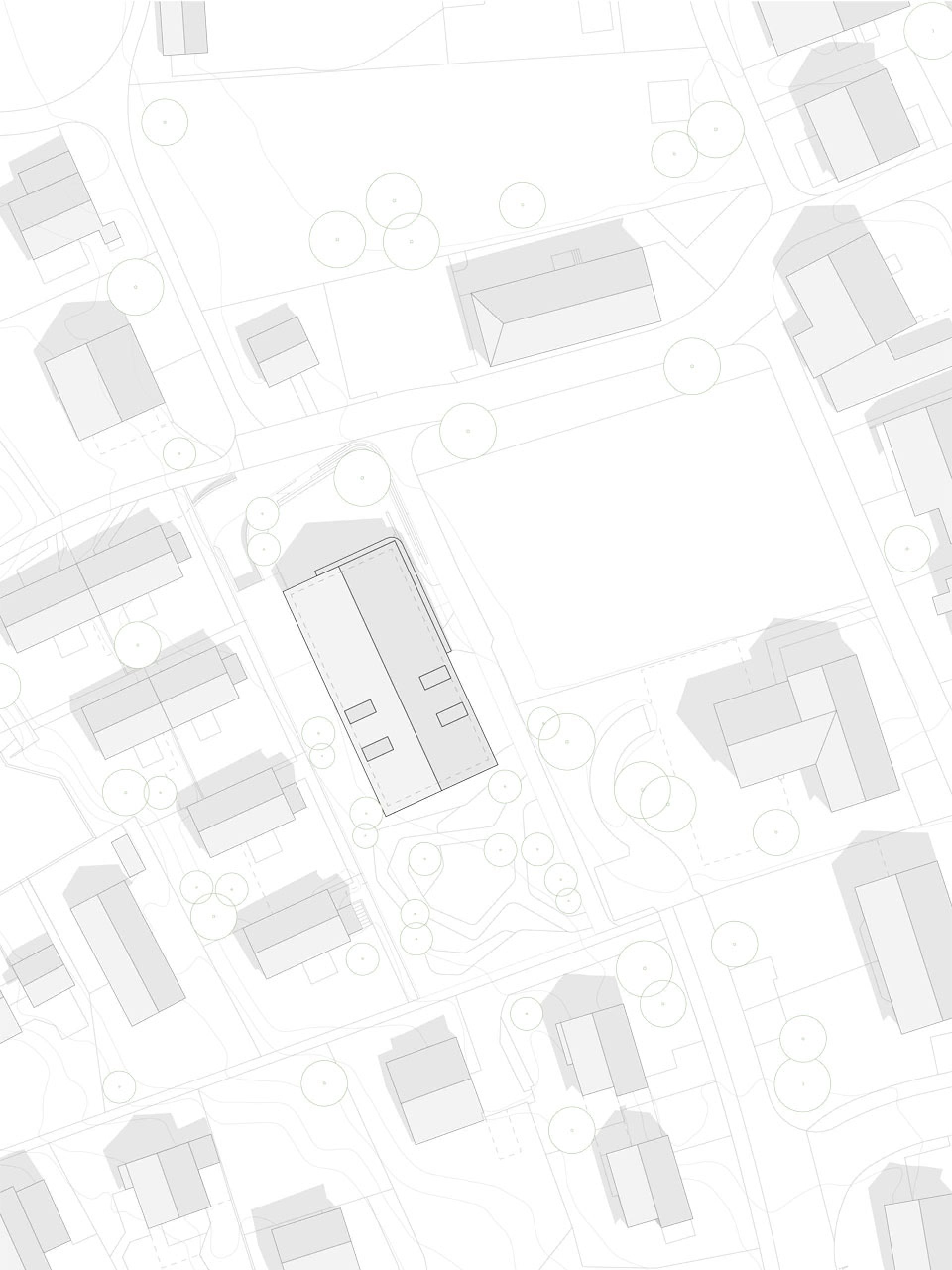 Der zum Erdgeschoss ebenerdige Vorplatz ist leicht von den öffentlichen Strassen abgesetzt und schafft einen klaren Auftakt zum Gebäude. Diese Erhöhung verleiht dem Raum eine besondere Präsenz und betont seine Bedeutung als Begegnungsort. Der Platz sowie die Setzung des Neubaus verbinden die neuen Nutzungen städtebaulich mit dem bestehenden Gemeindehaus. Das Erdgeschoss öffnet sich zur Ecke des öffentlichen Platzes und begrüsst die Besucher mit einer einladenden Geste, die eine harmonische Verbindung zwischen dem Innen- und Aussenraum herstellt.