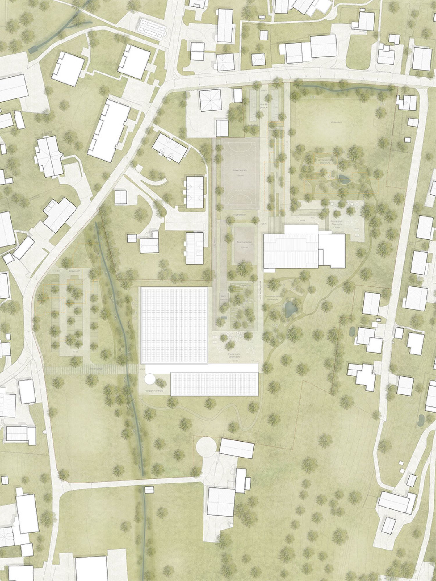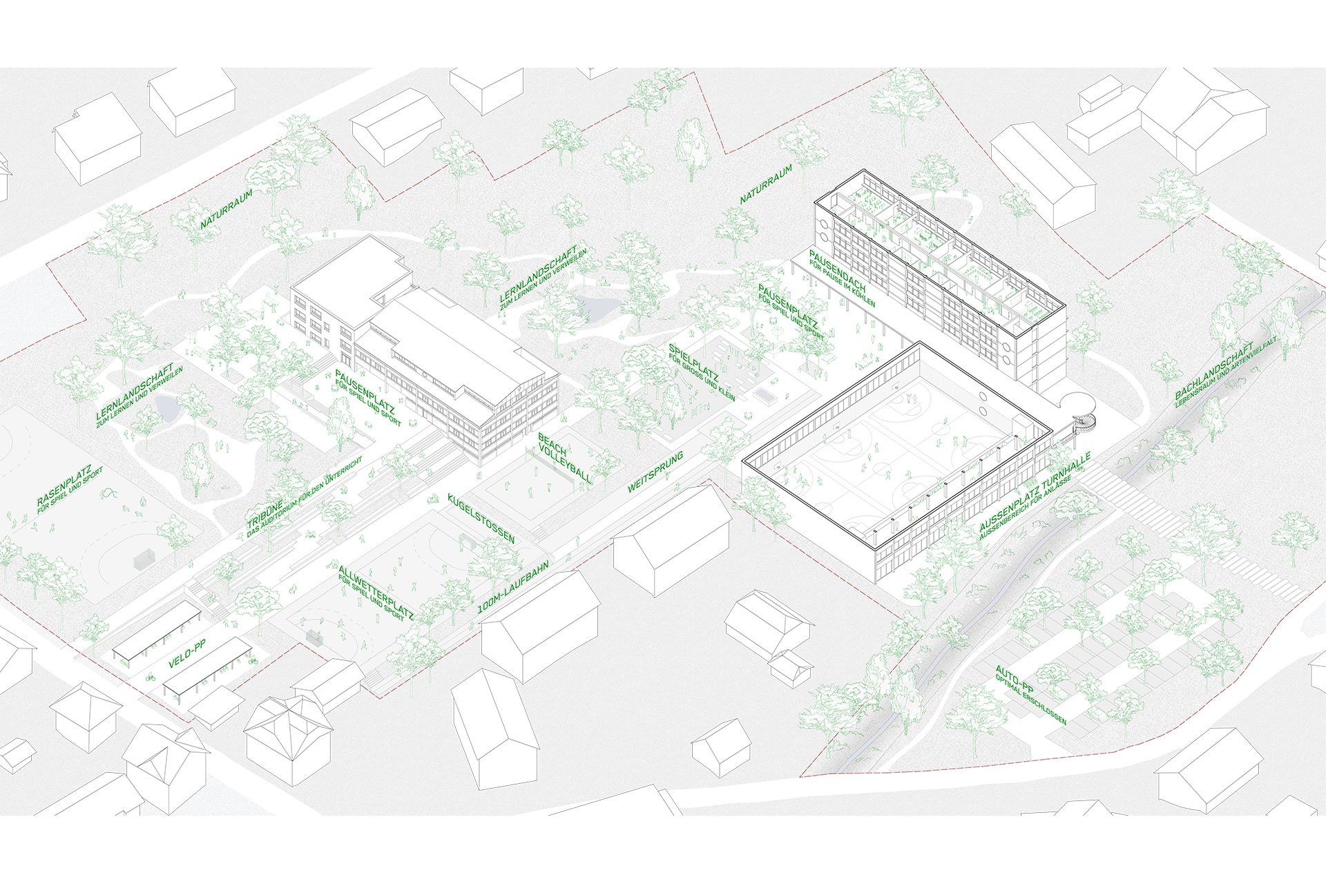 Eine zentrale Wegachse verbindet die Pausenflächen untereinander und gewährleistet eine direkte Verbindung von der Strasse Hofacker zu den Schulgebäuden. Zwei flexibel nutzbare Pausenplätze gliedern sich an die Achse an und spannen sich vor den Schulgebäuden auf. Die an die Achse angrenzenden Sportflächen, wie der bestehende Allwetterplatz, die Laufbahn und das verschobene Volleyballfeld werden mit einer aktiv nutzbaren Pausennische ergänzt. Die Nische dient als Spiel- und Aufenthaltsbereich, mit Sitzgelegenheiten und spannenden, abwechslungsreichen Spielelementen.