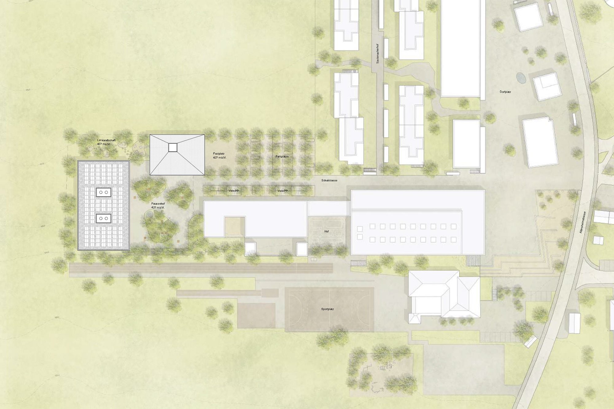 Zwischen dem bestehenden Gebäude und den Neubauten spannt sich der zentrale Pausenhof auf. Hier treffen sich die Lernenden vor dem Unterrichtsbeginn. Verschiedene Aufenthaltsbereiche und Nischen mit Sitzelementen, schattenspendenden Bäumen und frei bespielbare Belagsflächen dienen der Aufenthaltsqualität. Die kubischen Sitzelemente können einfach für Veranstaltungen umplatziert und auch gestapelt werden.