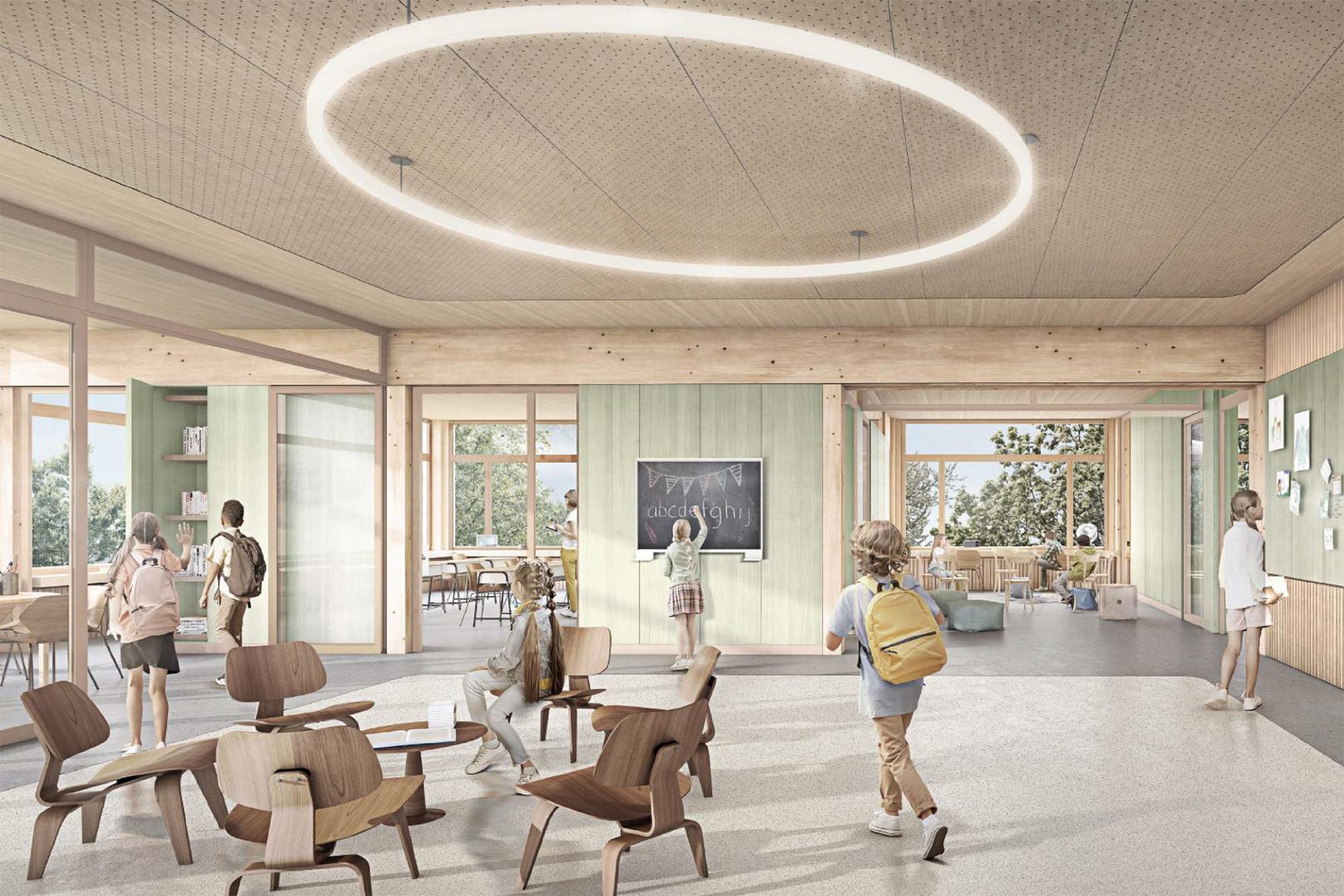 Das Pausenzimmer bietet eine Spielumgebung mit Elementen zum Spielen und Ausüben von Sport, wie zum Beispiel dem Parcour. Darüber hinaus schafft es einen Raum, der Parkplätze und Veloabstellmöglichkeiten unter dem Baumdach integriert und so eine einzigartige Umgebung schafft.